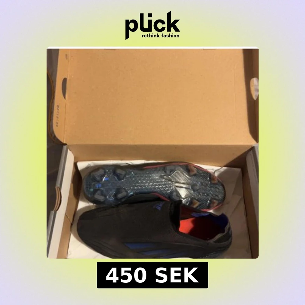 Säljer ett par svarta Adidas fotbollsskor med blå ränder på sidorna och röda detaljer. Skorna har en strömlinjeformad design utan snörning och genomskinliga dobbar undertill. Perfekta för dig som vill ha stilrena och snabba skor på planen.