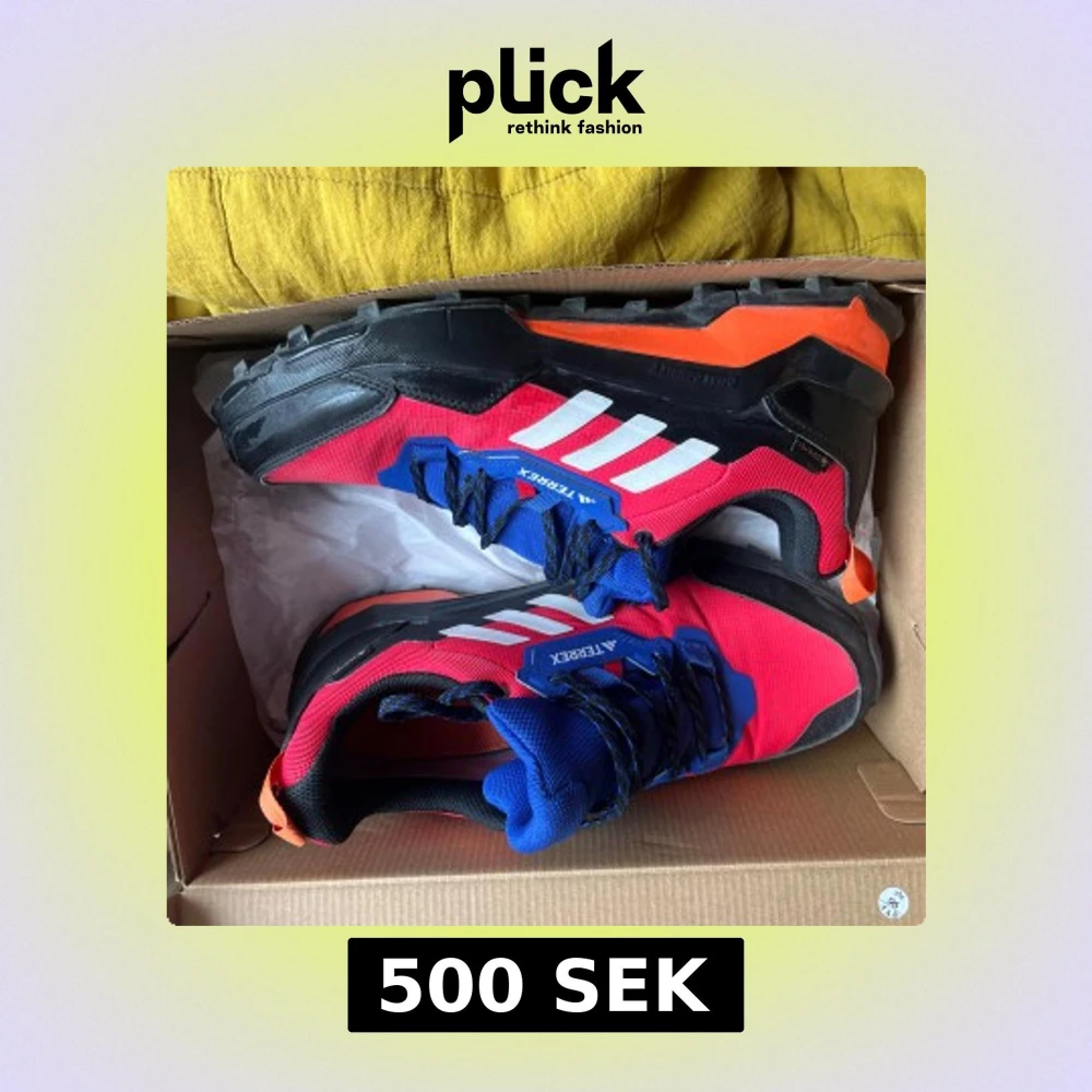 Säljer ett par Adidas Terrex AX4 GTX vandringsskor i rött, blått, svart och orange. Skorna har grov sula för bra grepp, snörning och är märkta med Terrex på sidan. Perfekta för utomhusaktiviteter och äventyr.