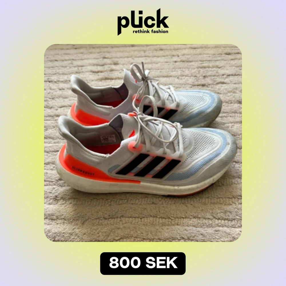 ett par ultraboost av den nyare versionen, använda en del men har bara fläckar som går att tvätta bort och inga permanenta defekter, storlek 43 och sitter otroligt skönt, nypris på dessa ligger på 2200kr