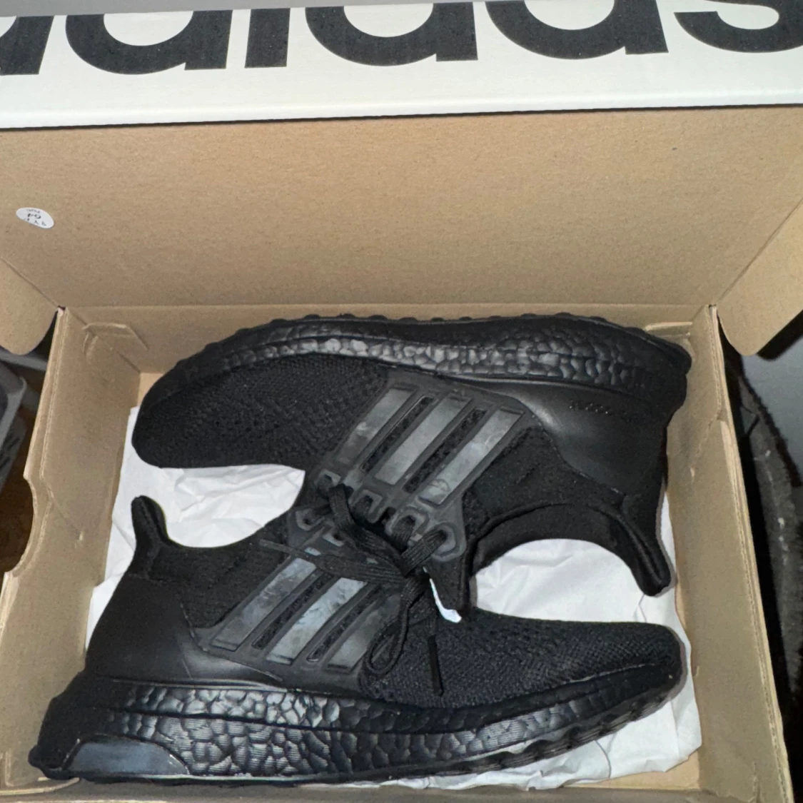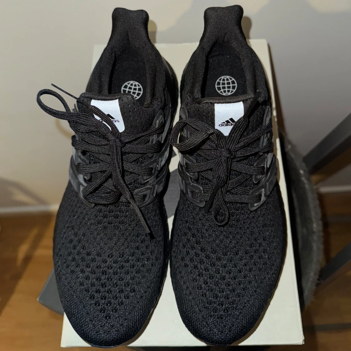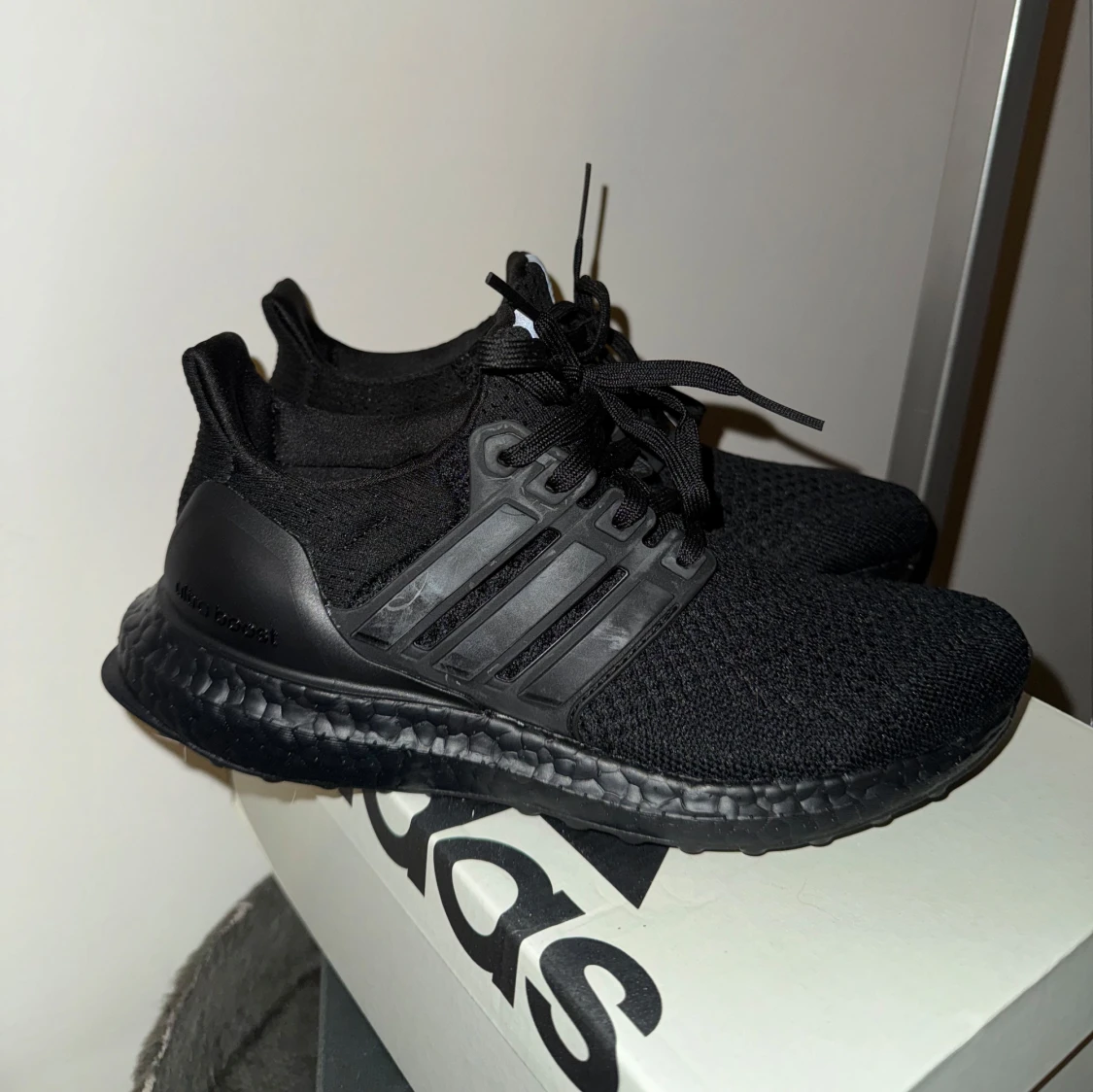 Säljer ett par helsvarta Adidas Ultraboost sneakers med stickad ovandel och klassiska tre ränder på sidan. Skorna har snörning, platt sula och en bekväm boost-mellansula. Perfekta för dig som vill ha en stilren och sportig look. Aldrig använda.