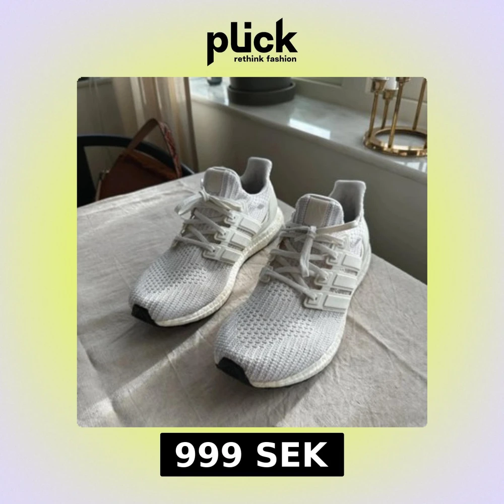 Säljer ett par fräscha vita Adidas Ultraboost sneakers med stickad ovandel och klassiska tre ränder på sidorna. Skorna har snörning, platt sula och bekväm boost-dämpning. Perfekta för dig som gillar stilrena och sportiga sneakers. Skick: 10/10. Om du har frågor så är det bara att pm ;)