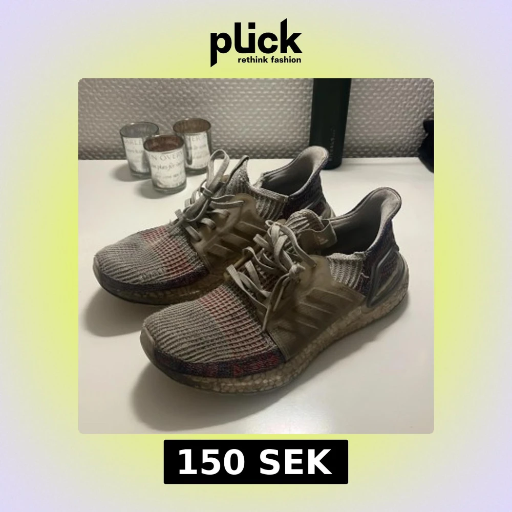 Adidas Ultraboost sneakers i grått med stickad ovandel och inslag av rött och blått. Skorna har snörning, platt sula och en bekväm Boost-mellansula. Perfekta för dig som gillar sportig stil och vill ha maximal komfort i vardagen.