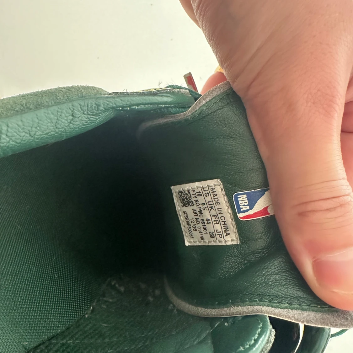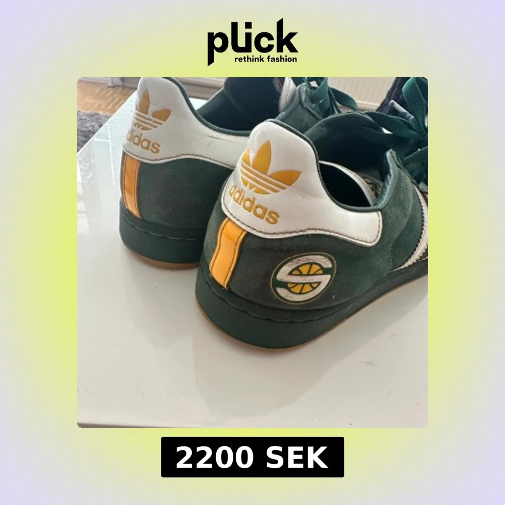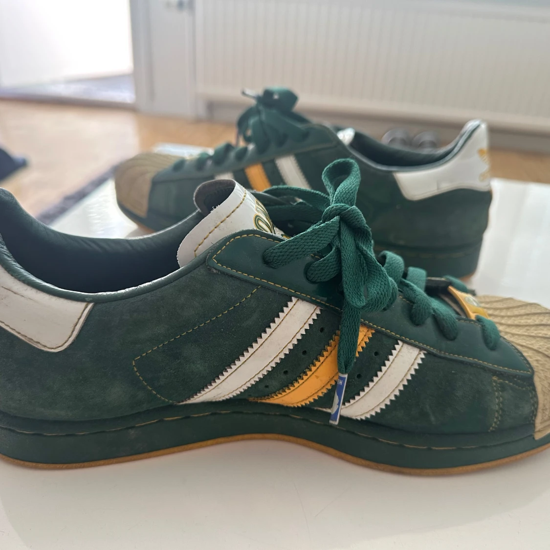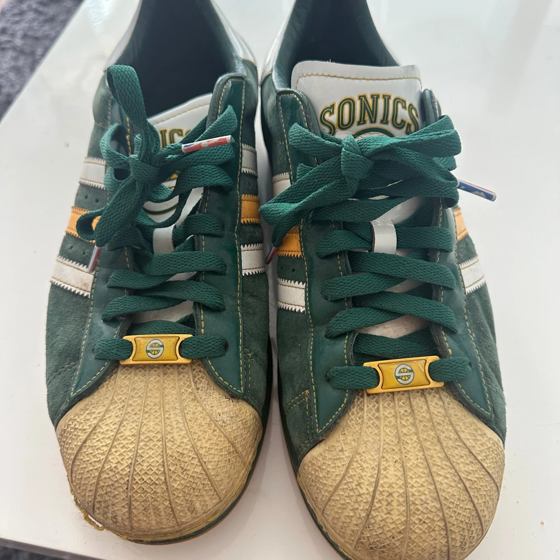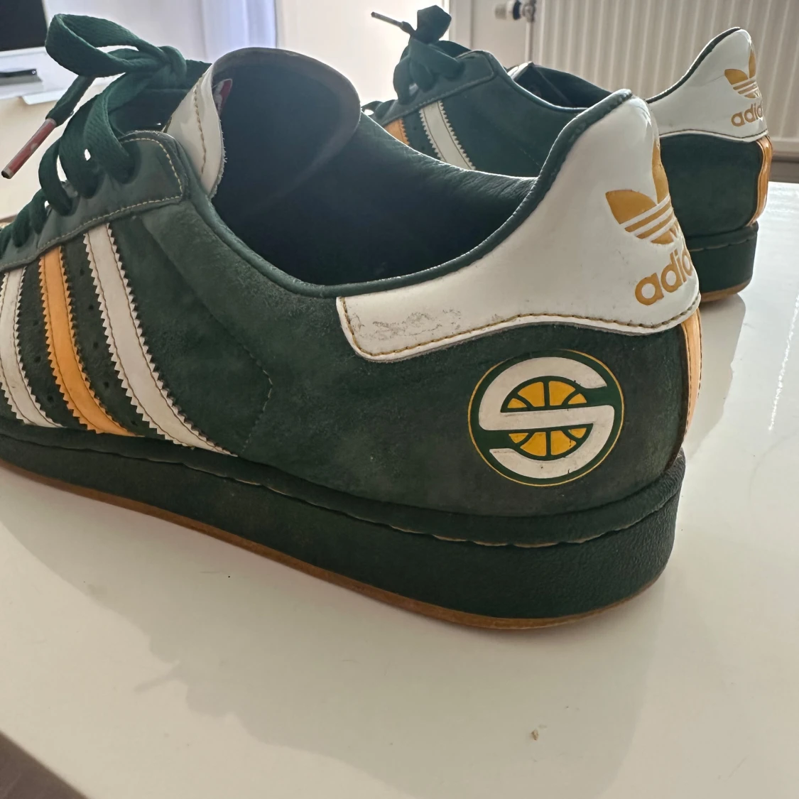Unika Adidas Superstar sneakers i Seattle Sonics NBA edition. Skorna har grön mocka, vita och gula detaljer, klassiska tre ränder på sidan och Sonics-logga på hälen och snörningen. Skalet framtill är beige och snörningen är grön. Perfekt för dig som gillar basket och retrostil ny pris 360dollar storlek 44