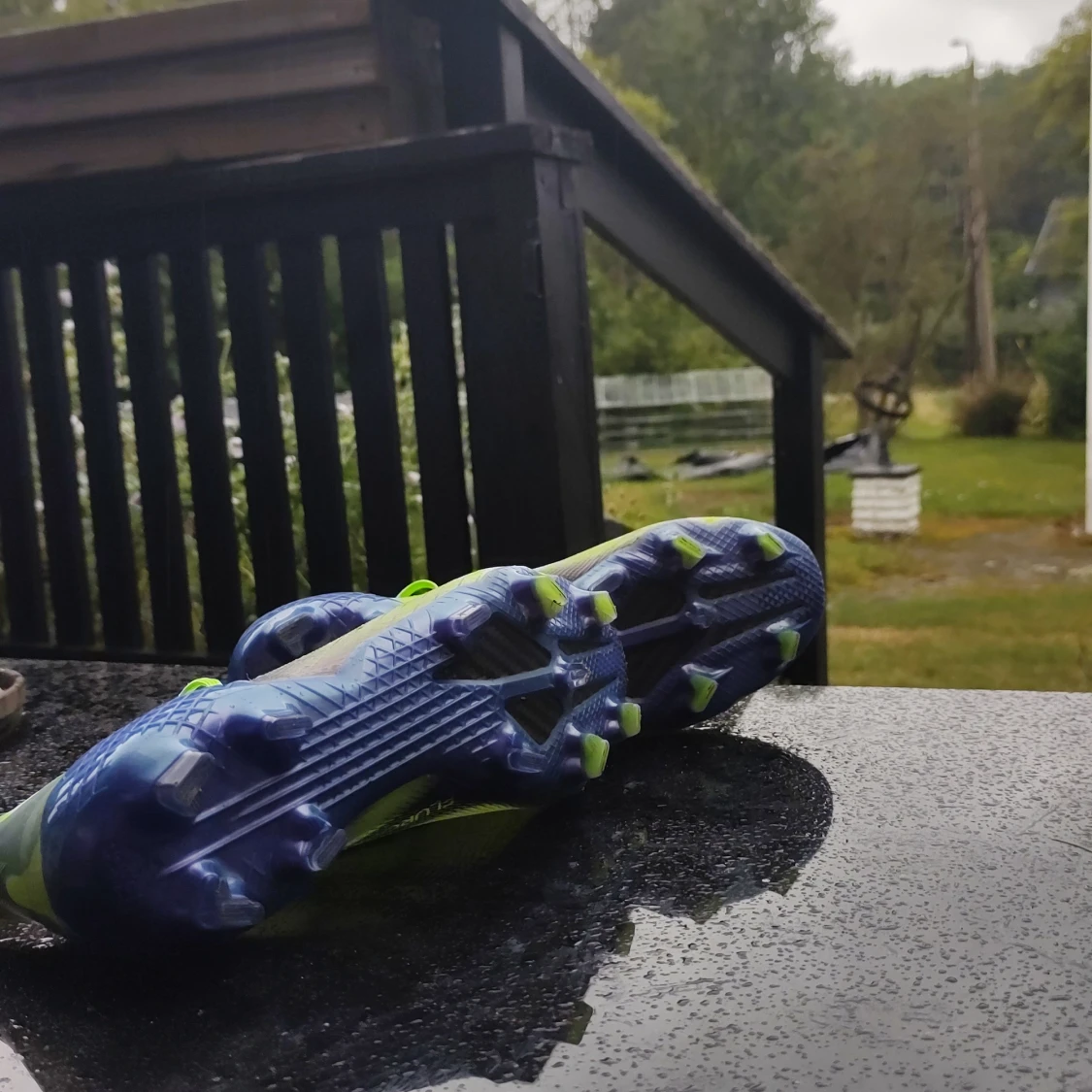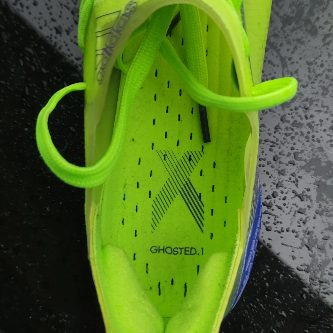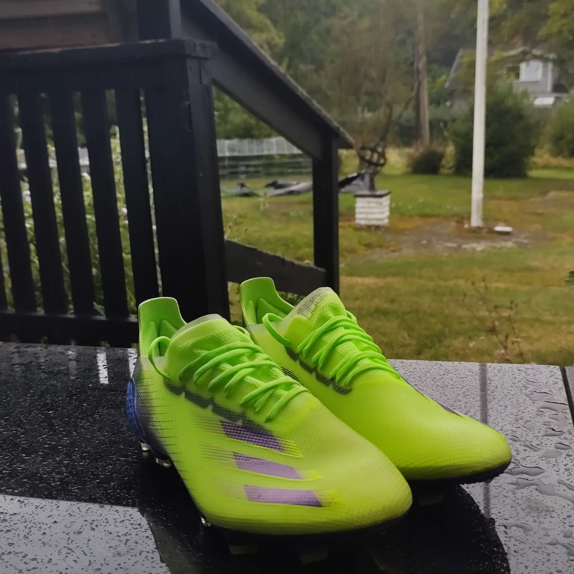 Säljer ett par Adidas X Ghosted.1 fotbollsskor i neon-gul färg med lila detaljer och blå sula. Skorna har snörning och är tillverkade i lätt syntetmaterial för maxad speed på planen. Perfekta för dig som vill sticka ut och ha grymt grepp på gräs.