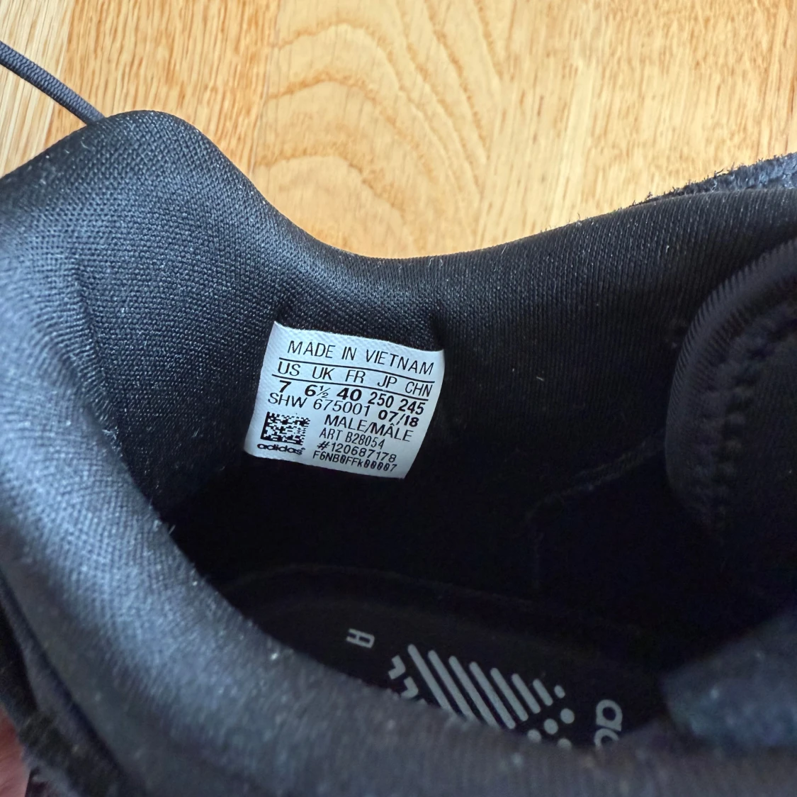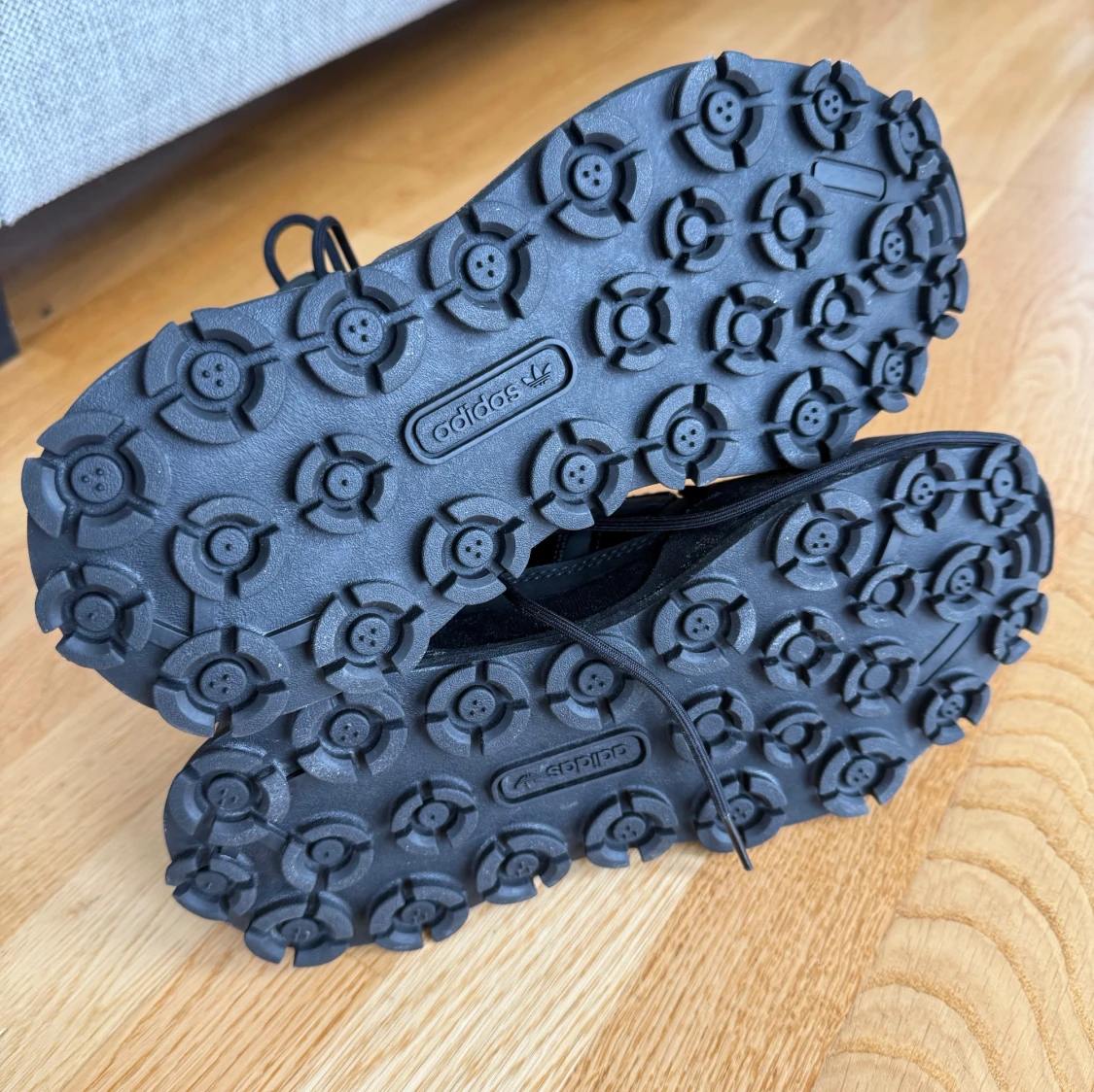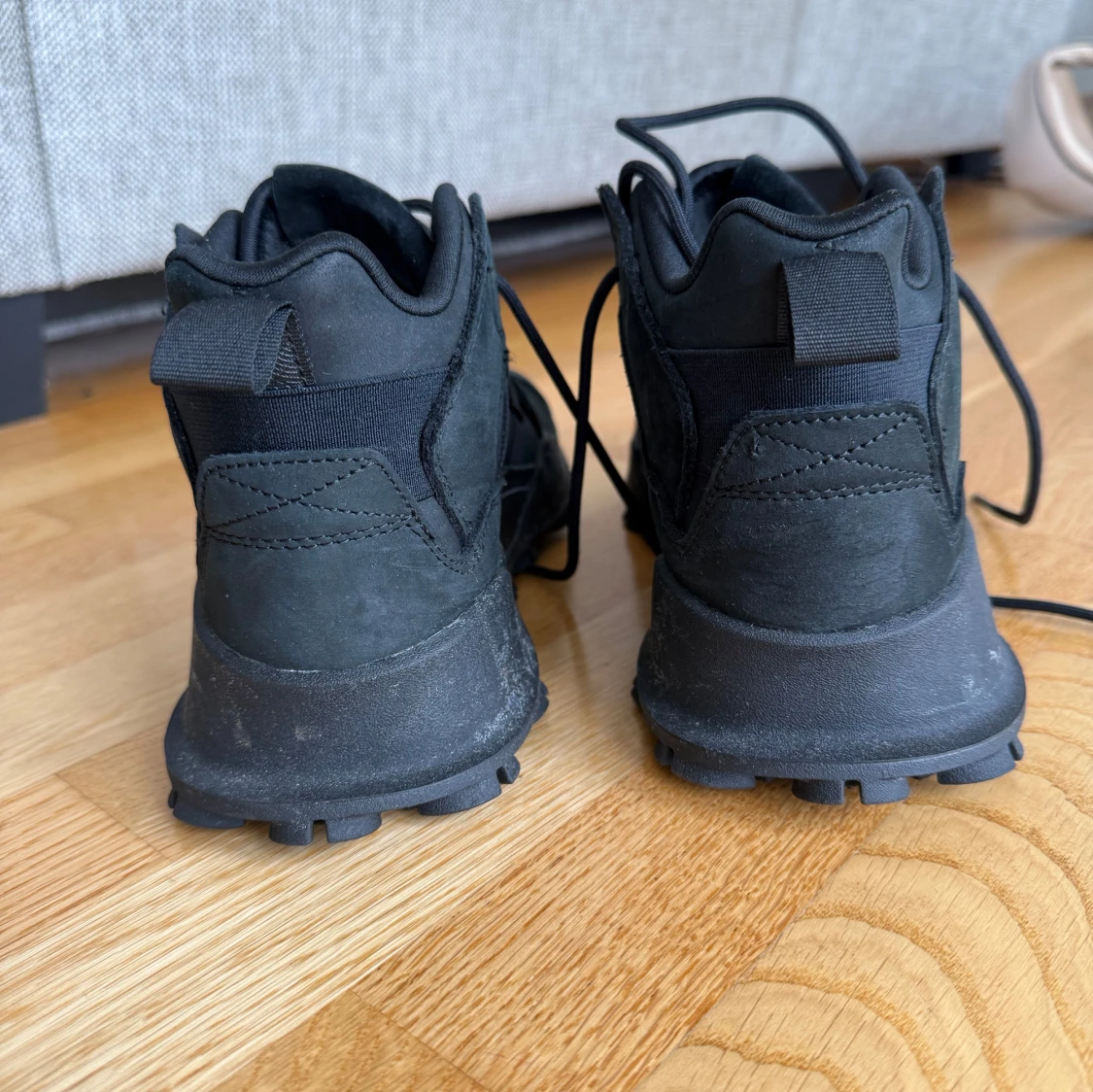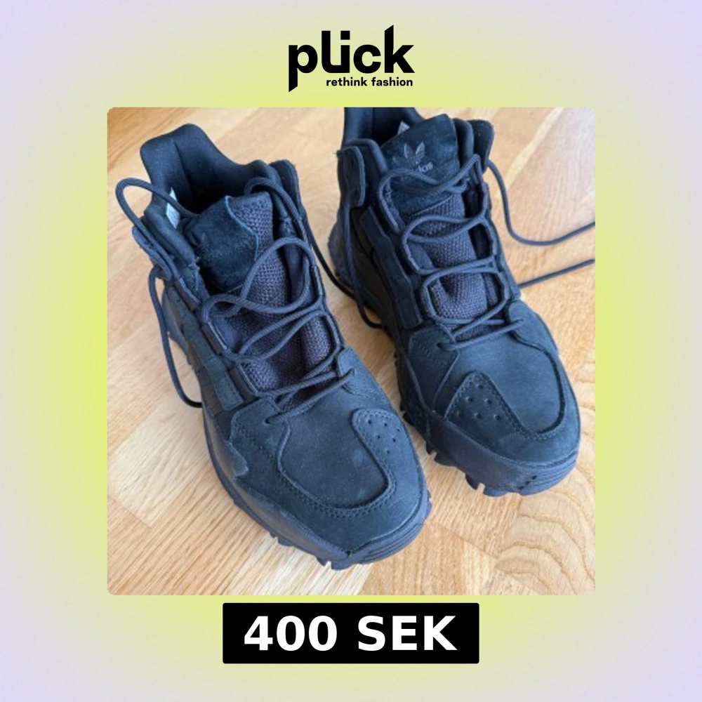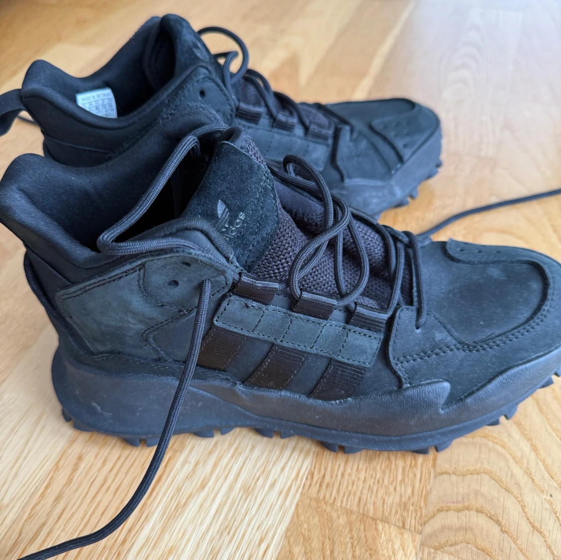 Svarta adidas sneakers med högt skaft och grov, mönstrad yttersula för extra grepp. Skorna har snörning, mockadetaljer och klassiska tre ränder på sidan. Ovandelen är en mix av mocka och textil, vilket ger en cool och sportig vibe. Varma och perfekta för höst och vinter. Köpt till herr men funkar unisex. Använda en gång.
