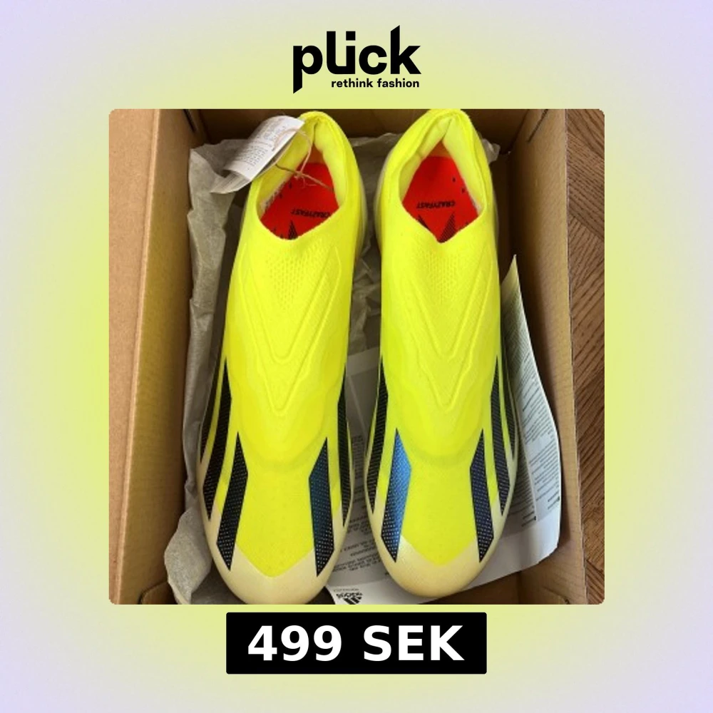 Säljer ett par Adidas X Crazyfast Elite LL FG fotbollsskor i en iögonfallande gul färg med svarta och blå detaljer. Skorna har en strömlinjeformad design utan snörning och är perfekta för spel på fasta underlag.