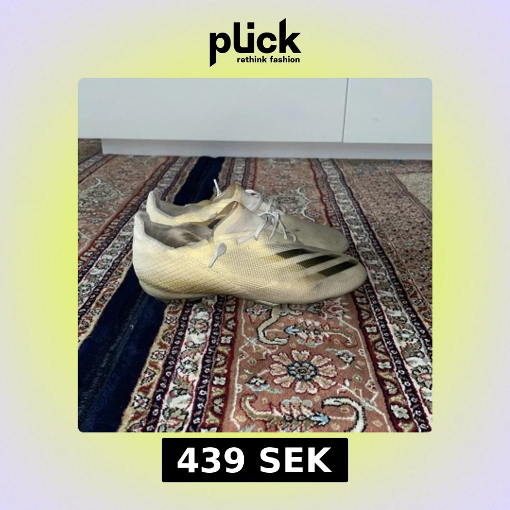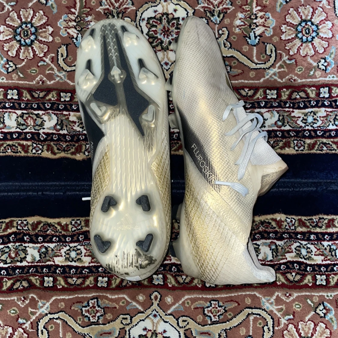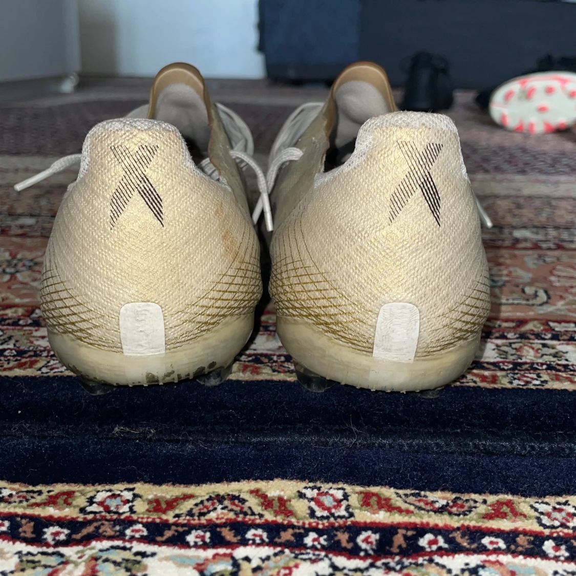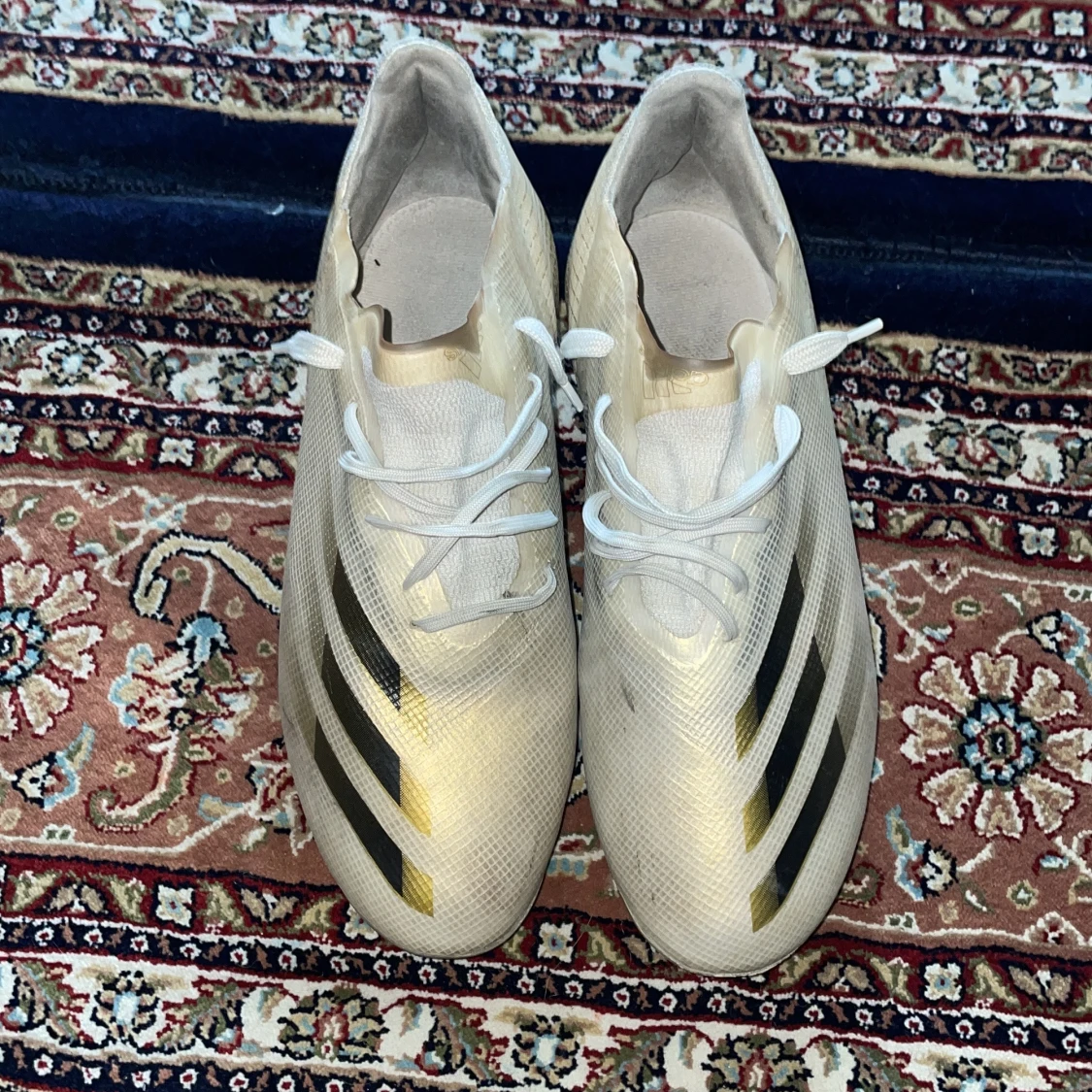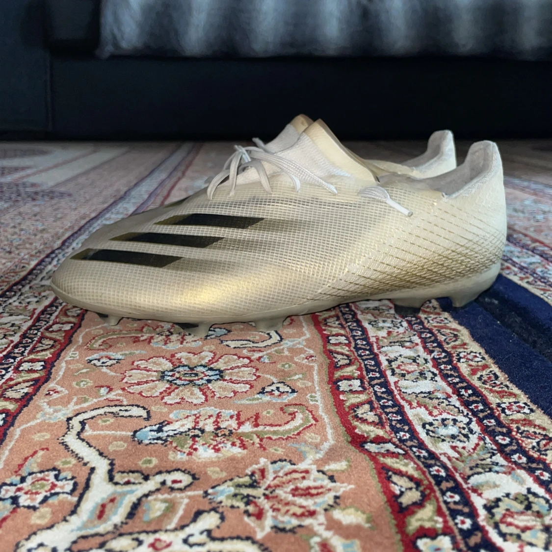 Säljer ett par Adidas X ghoasted fotbollsskor i guldigt och vitt med svarta ränder på ovansidan. Skorna har snörning och är tillverkade i lätt syntetmaterial för bästa känsla på planen. Perfekta för dig som vill sticka ut med stilrena och snabba skor.