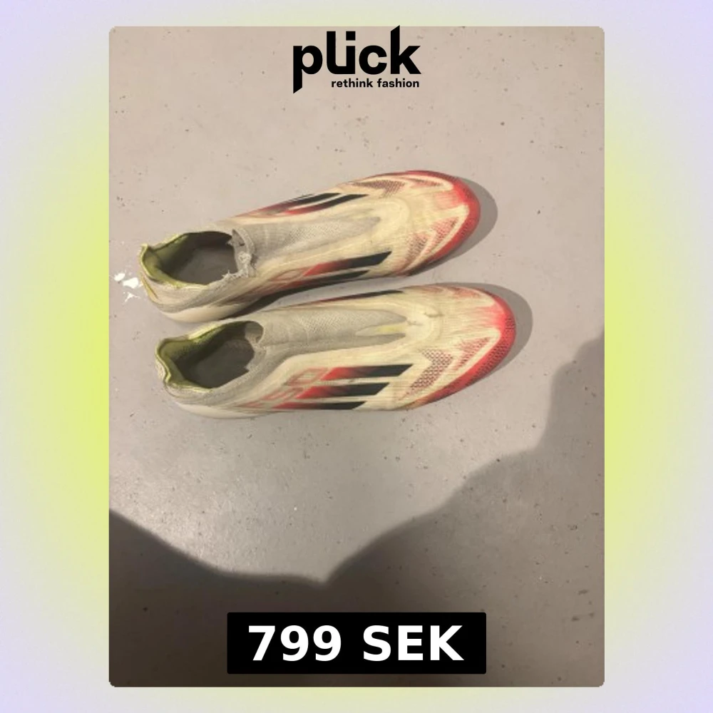 Säljer ett par Adidas X Speedflow fotbollsskor i en snygg mix av vitt, rött och svart med gula detaljer. Skorna har en strömlinjeformad design utan snörning, platt sula med dobbar och är tillverkade i syntetmaterial för lätt känsla på planen.