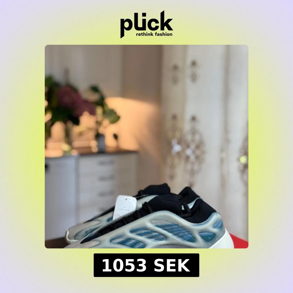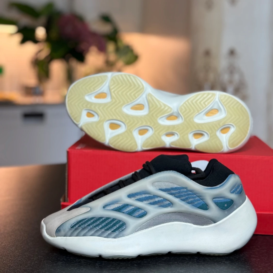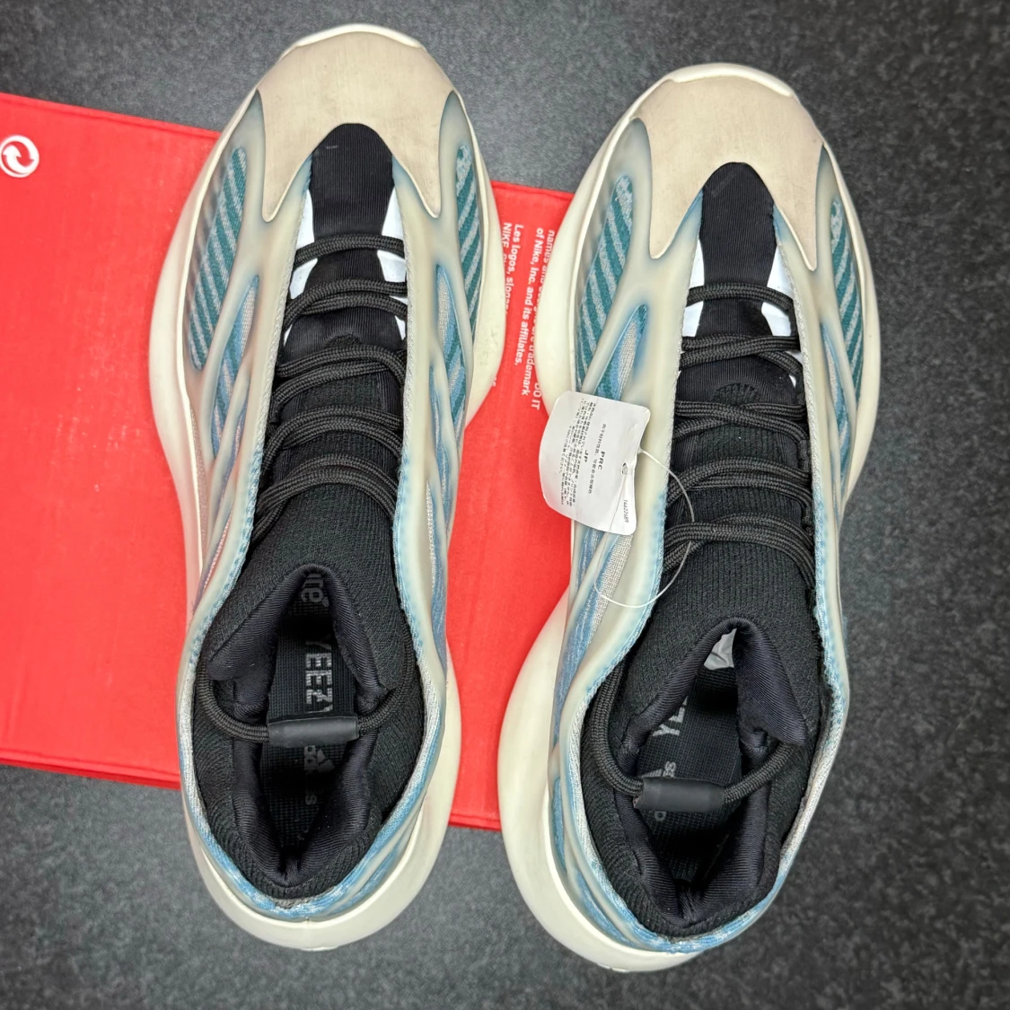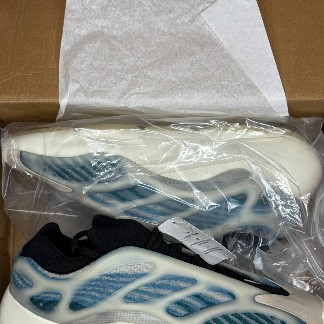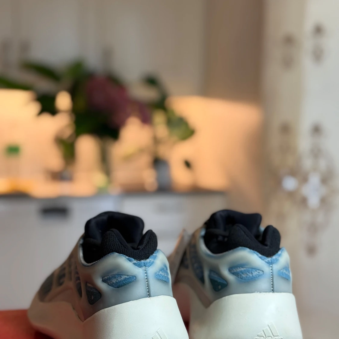 Säljer ett par Adidas Yeezy 700 V3 sneakers i blått och vitt med svarta detaljer. Skorna har en futuristisk design med mesh och syntetmaterial, samt snörning och rund tå. Den tjocka vita sulan ger en cool siluett och de blå inslagen gör dem riktigt unika.