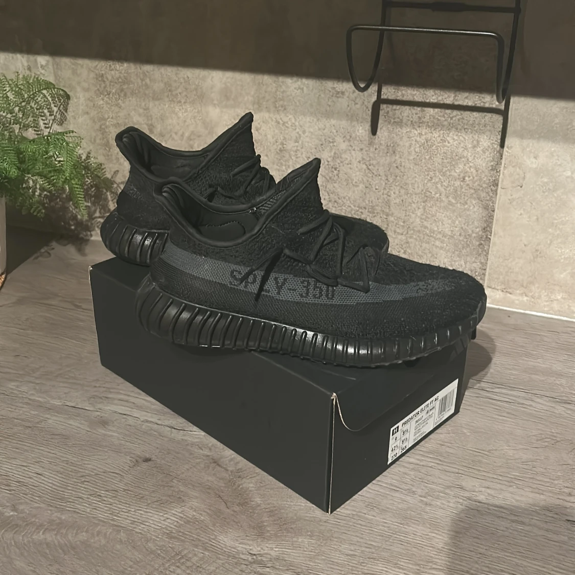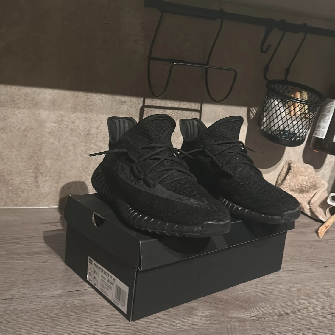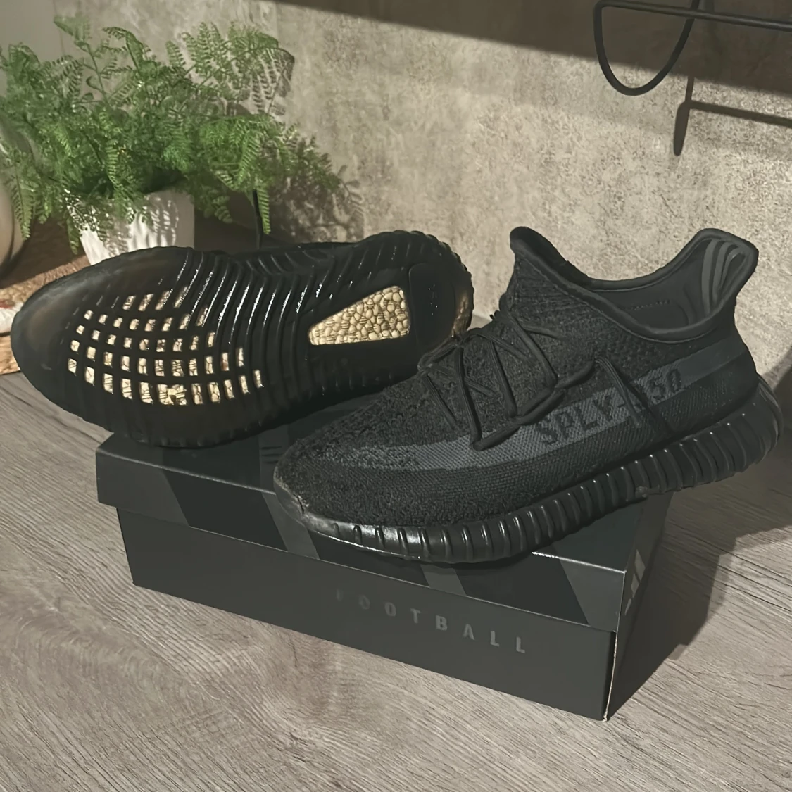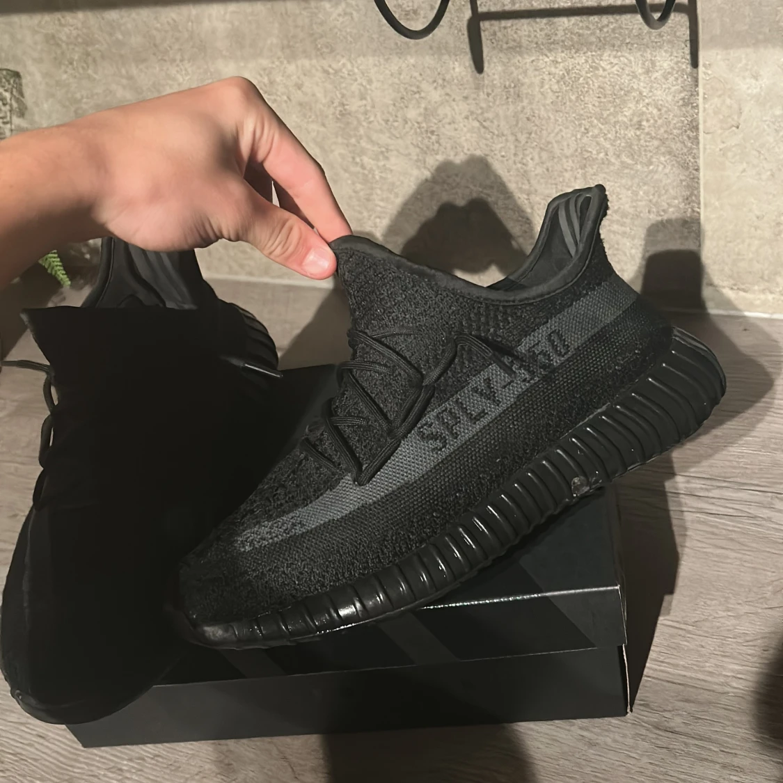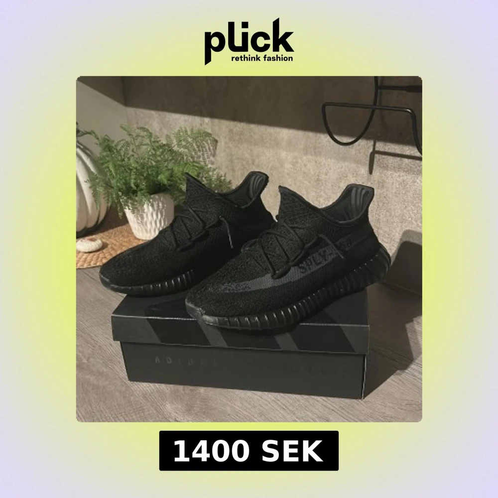 Säljer ett par Adidas Yeezy Boost 350 V2 i helsvart färg. Skorna har stickad ovandel i syntet, klassisk Yeezy-silhuett och svart sula med ribbad struktur. Sidan pryds av den ikoniska SPLY-350-texten. Perfekta för dig som gillar streetwear och vill ha något unikt.