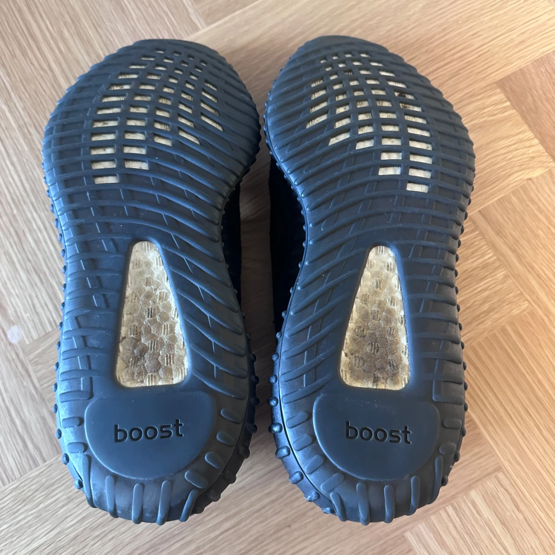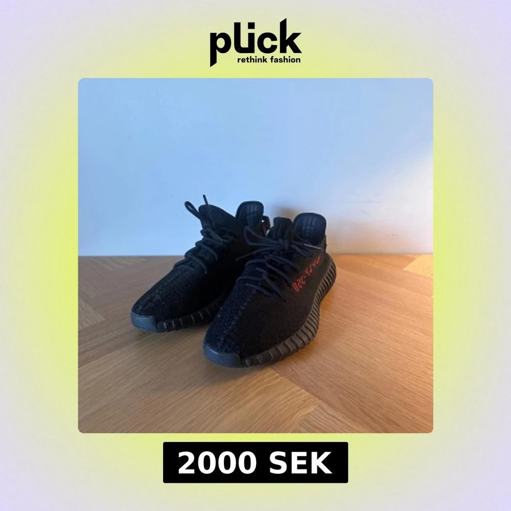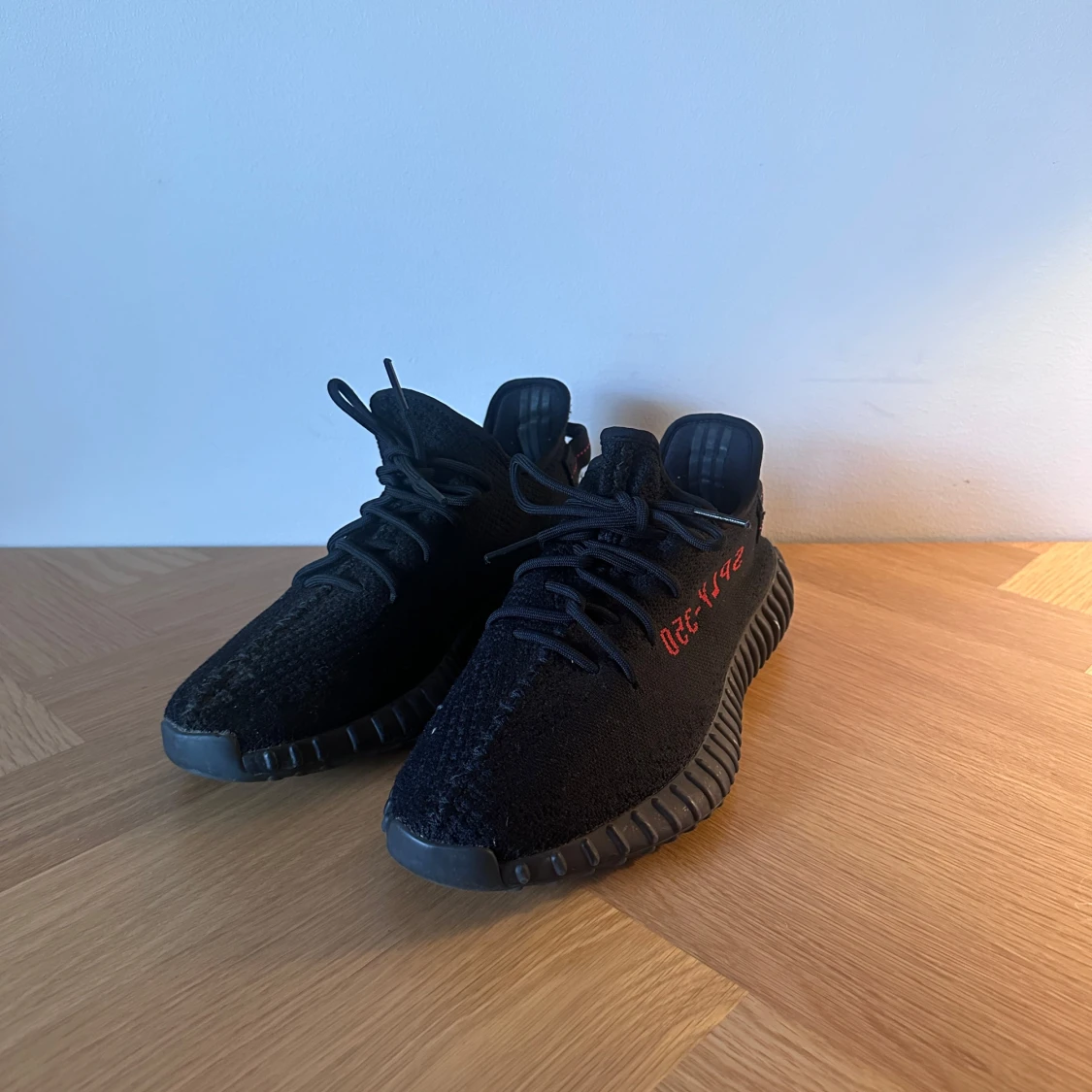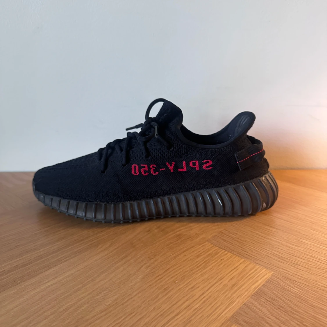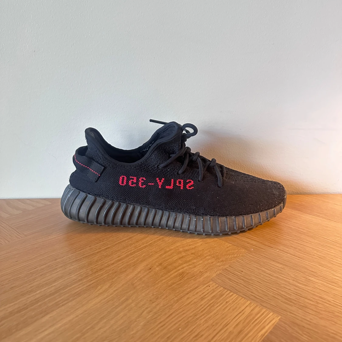 Säljer ett par Adidas Yeezy Boost 350 V2 i svart med röd SPLY-350 text på sidan. Skorna är i storleken 44. Skorna har en stickad ovandel, snörning och en grym boost-sula för maxad komfort. Perfekt för dig som gillar streetwear och vill ha något som sticker ut.