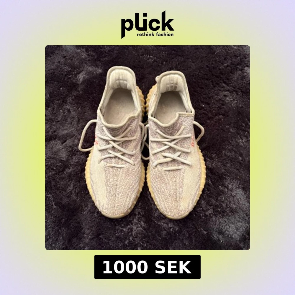 Säljer ett par Adidas Yeezy Boost 350 V2. Skorna har en stickad ovandel i beige och vit ton, med klassisk snörning och texten 'SPLY-350' i rött på sidan. Sulan är ribbad och i ljusbrun gummi för extra komfort och stil.