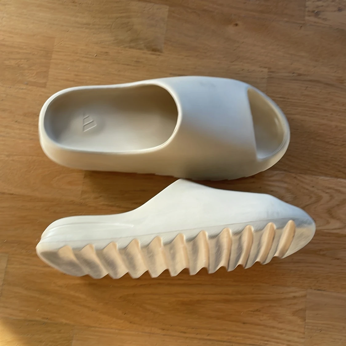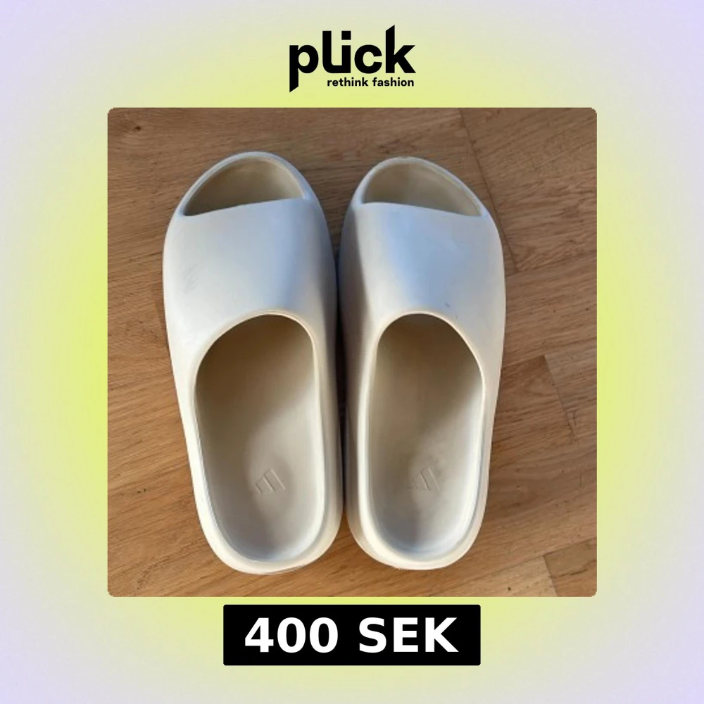 Adidas Yeezy Slide i beige med chunky, räfflad sula och öppen tå. Slidesen har en minimalistisk design och är tillverkade i syntetmaterial som ger en mjuk och bekväm känsla. Perfekt för dig som gillar streetwear och vill ha något stilrent till sommaren.