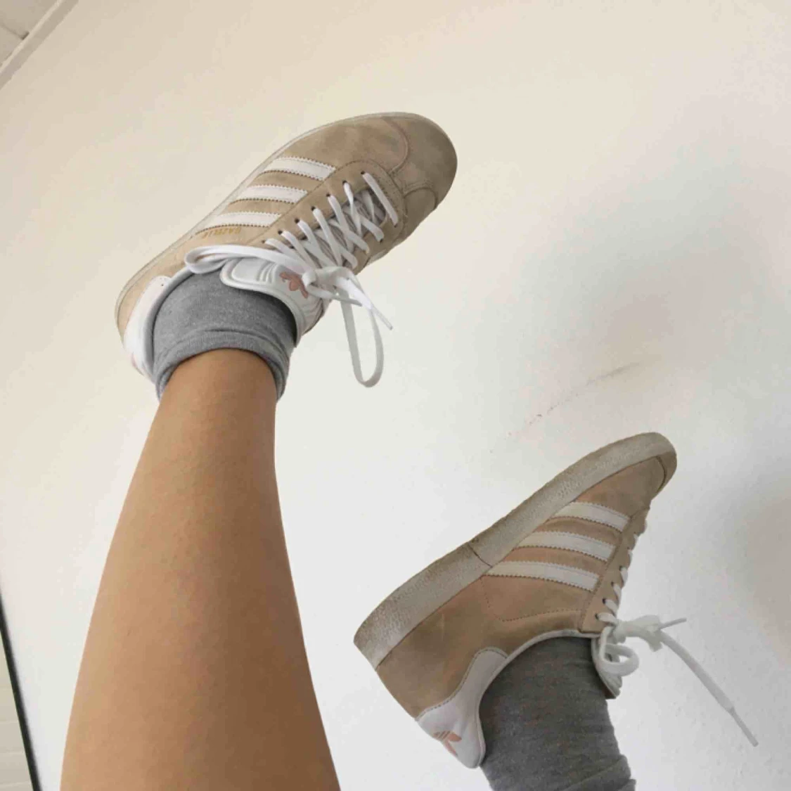 Jättefina ljusrosa adidas gazelle, lite smuts på sulan annars är de i jättefints skick. Svårt att få färgen rätt på bild men den är mest lik färgen på första eller sista bilden. Nypris 1000 kr och har använt dem 4 gånger, så ett riktigt kap!