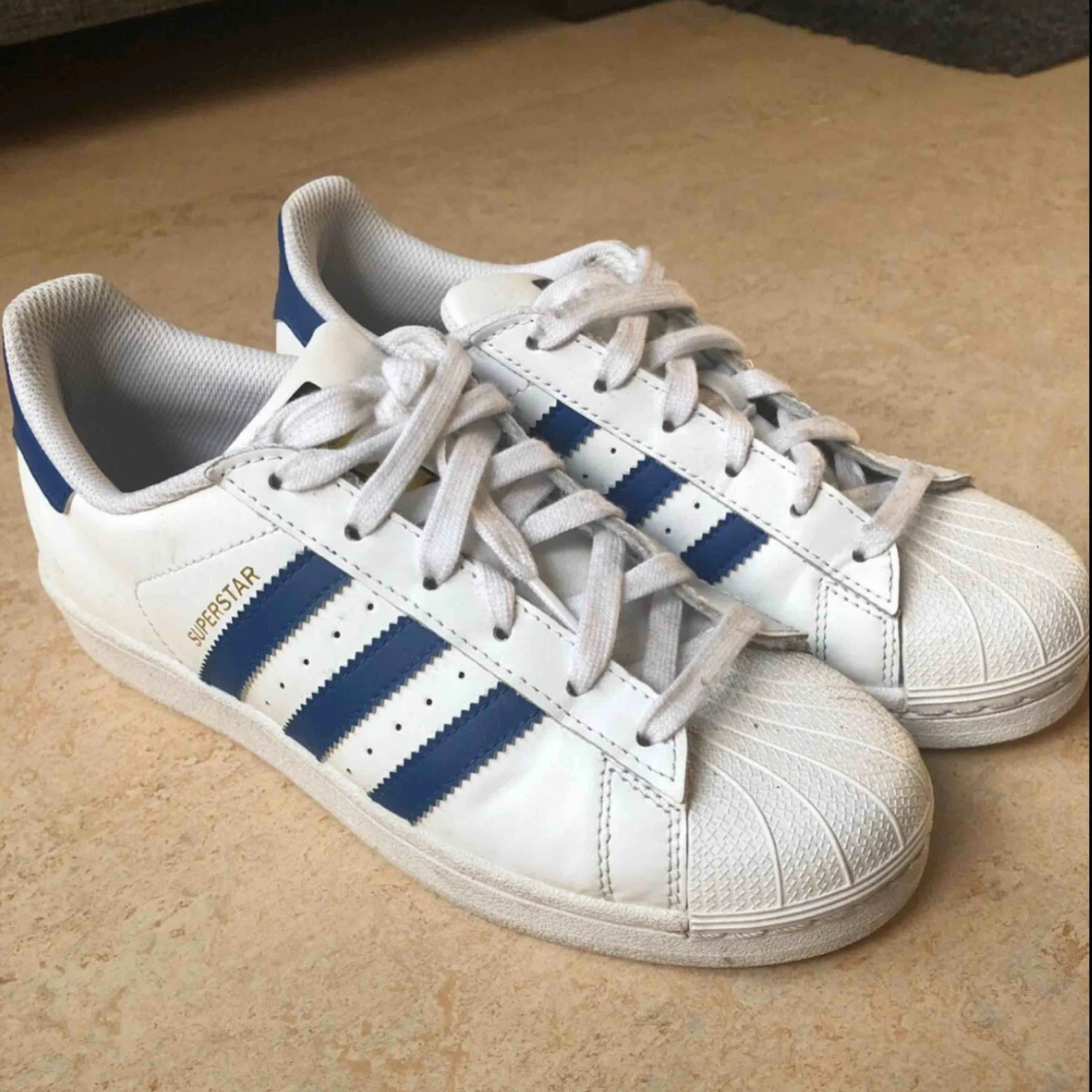 Adidas superstar med blåa ränder. Använda max 3 ggr, som nya!