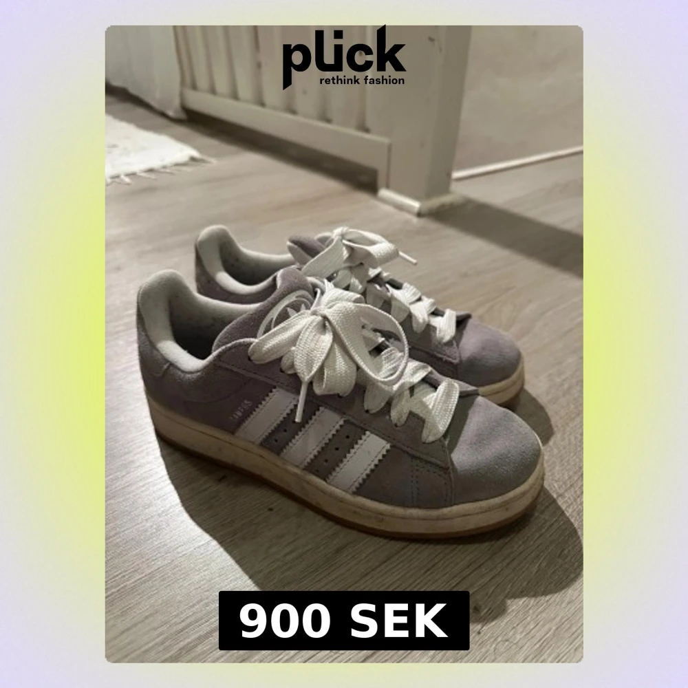 Säljer ett par grå Adidas Campus sneakers med klassiska vita ränder på sidorna och vit sula. Skorna har rund tå, platt sula och är tillverkade i mjuk mocka med vita snören. Perfekt för dig som gillar retrostil och streetwear.