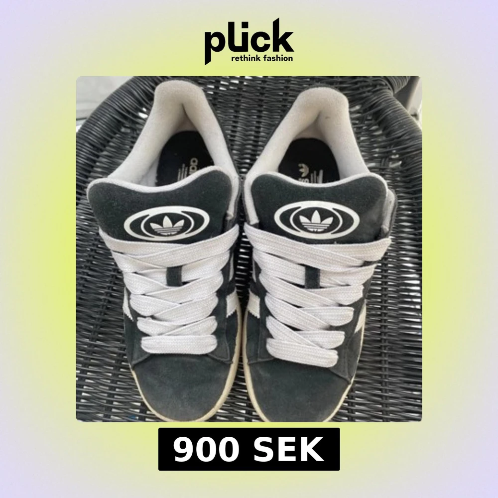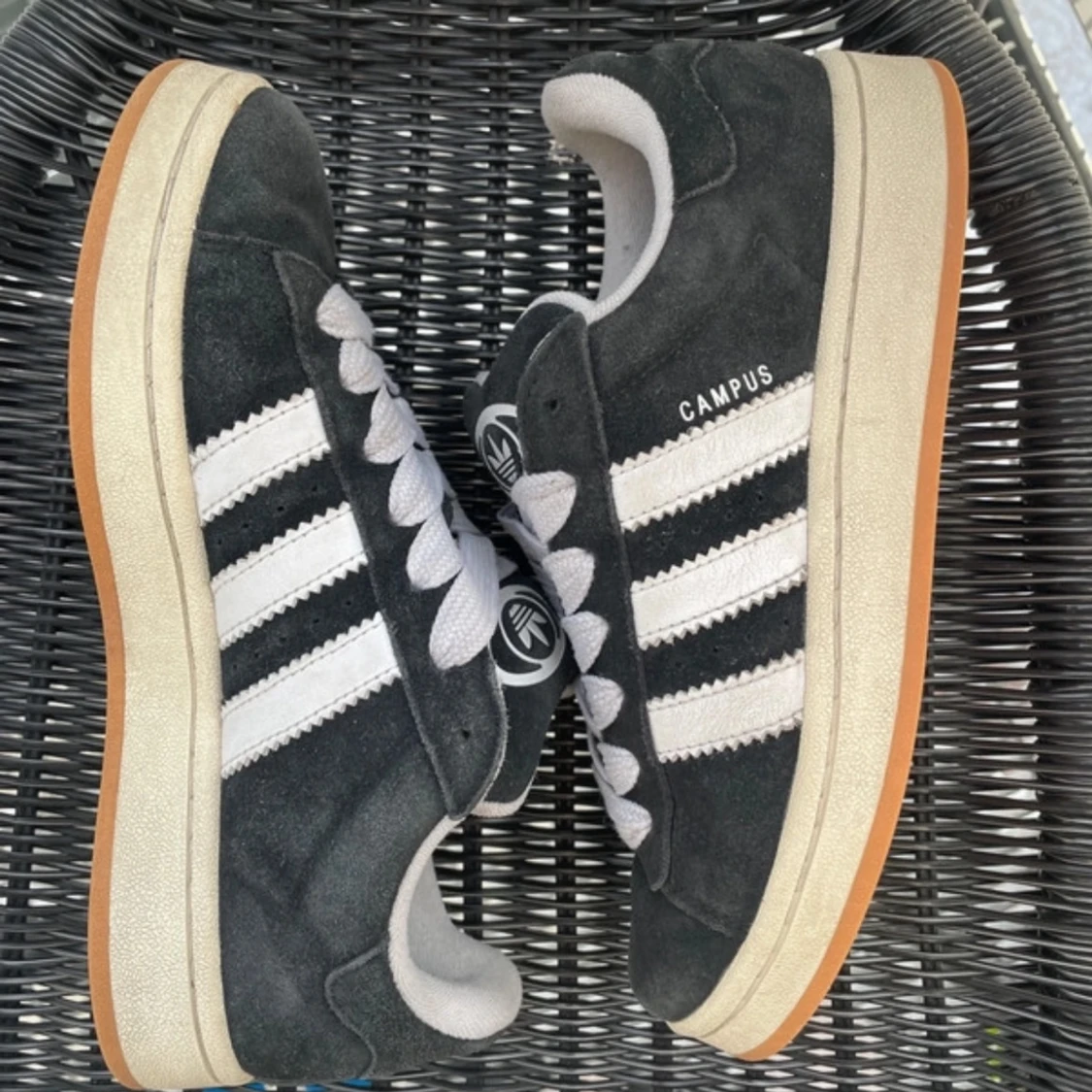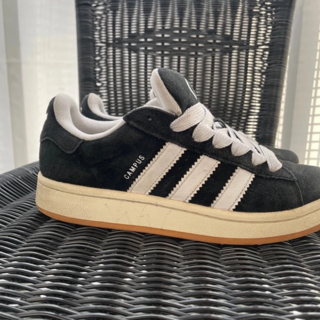 Snygga svarta Adidas Campus sneakers med vita detaljer och klassiska tre ränder på sidan. Skorna har en bekväm gummisula i ljusbrun färg och är tillverkade i mocka. Perfekta för en stilren och avslappnad look.