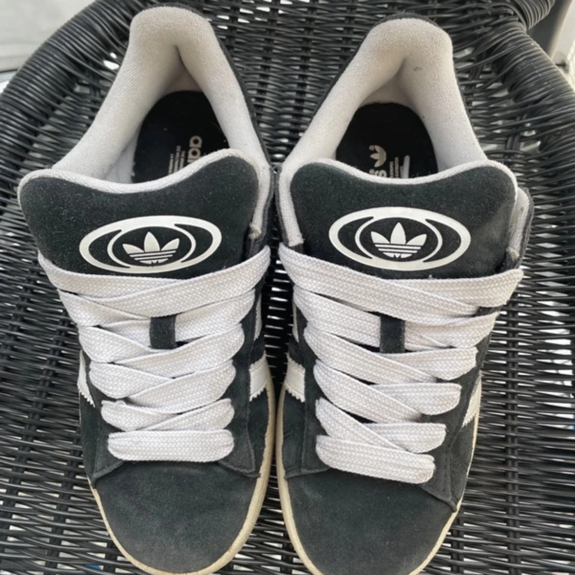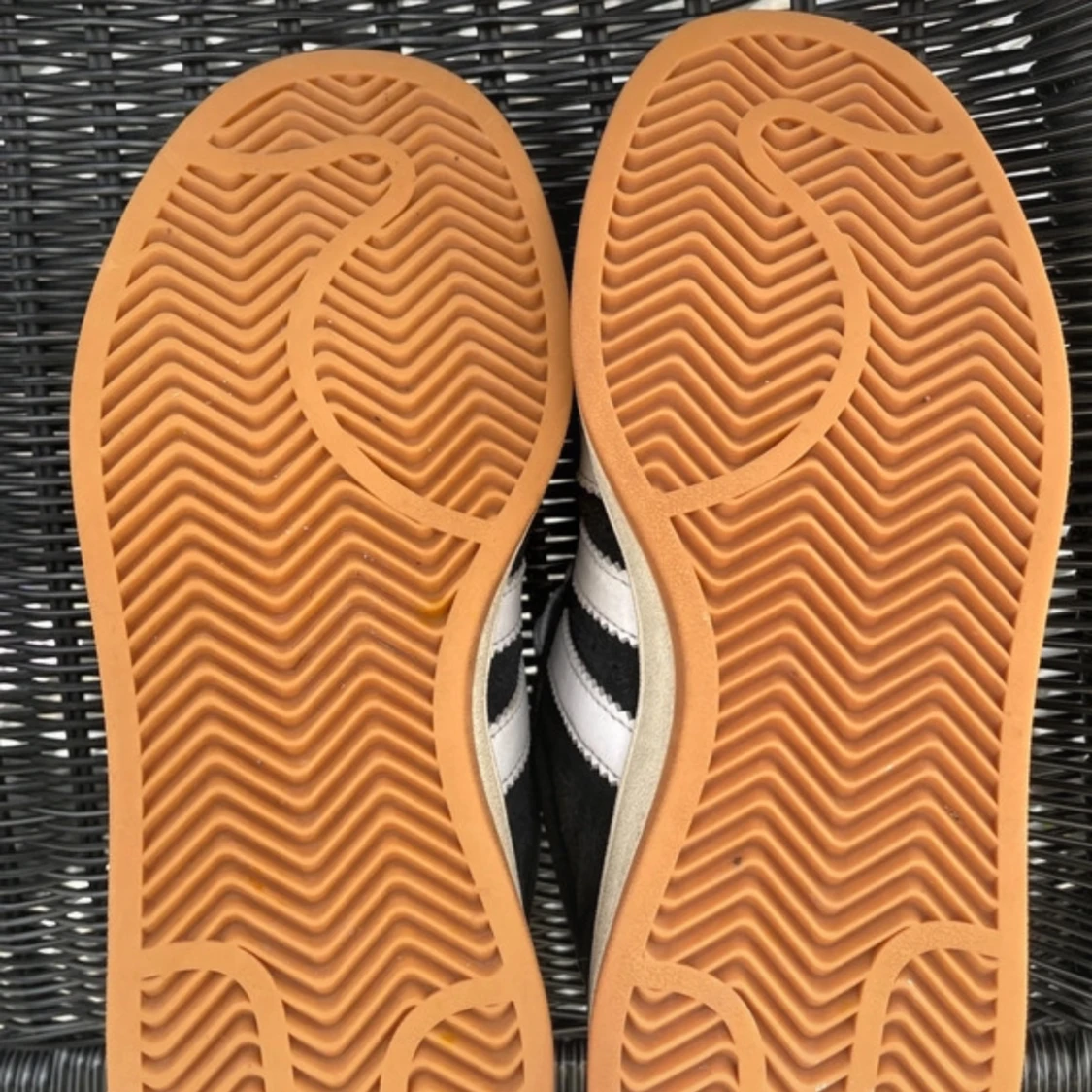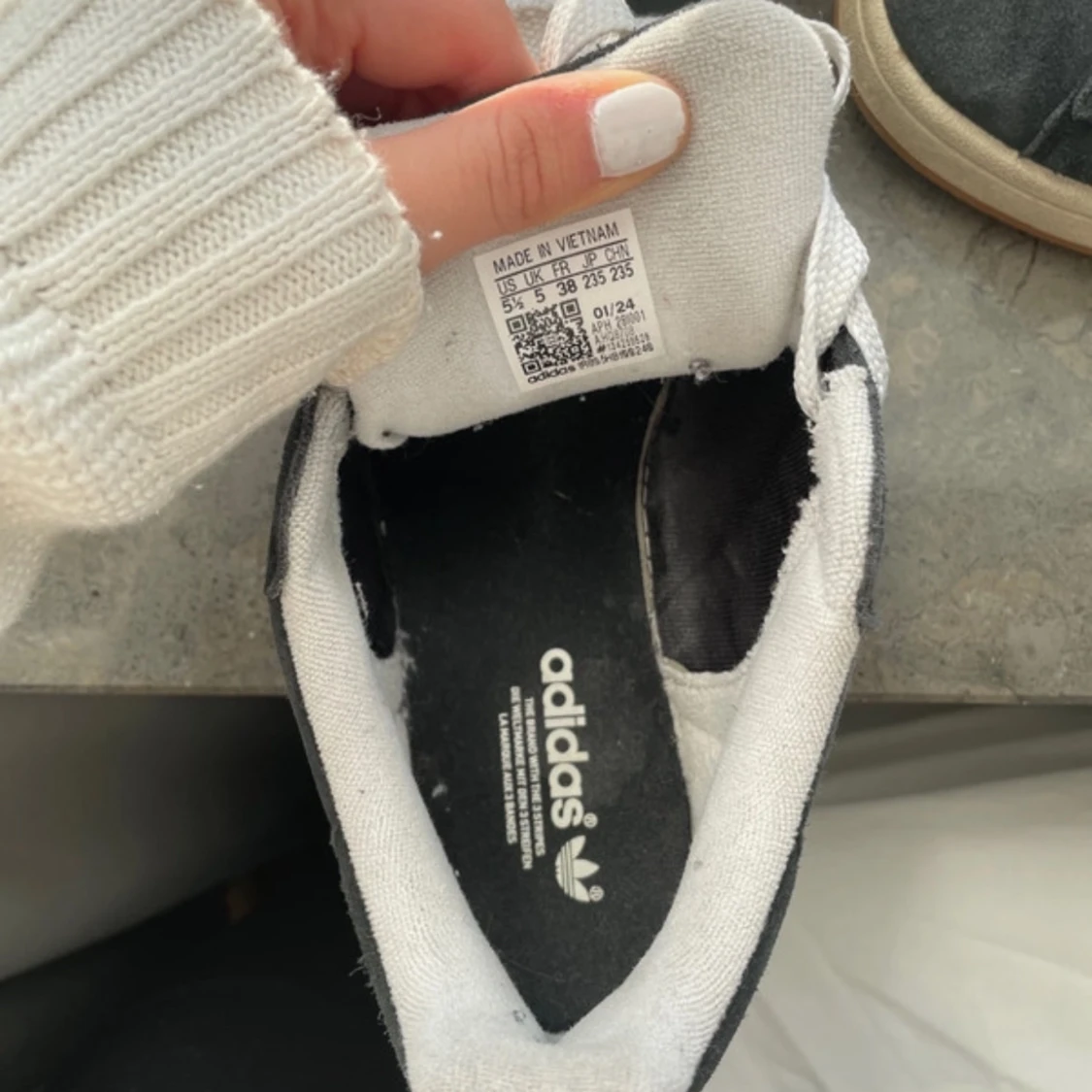 Snygga svarta Adidas Campus sneakers med vita detaljer och klassiska tre ränder på sidan. Skorna har en bekväm gummisula i ljusbrun färg och är tillverkade i mocka. Perfekta för en stilren och avslappnad look.