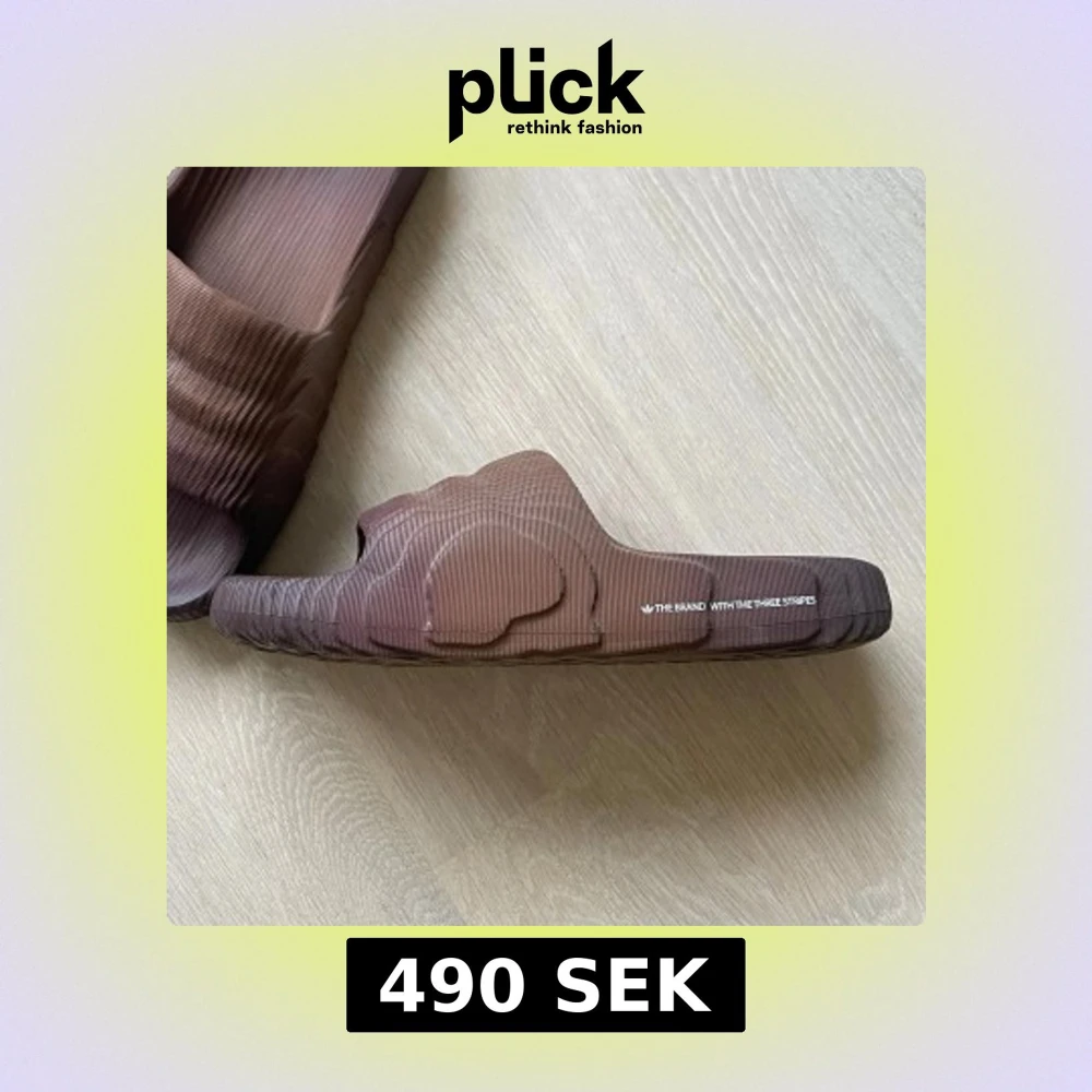 Chunky slides från Adidas i en brun färgton med ribbad textur och coolt mönster i materialet. Sulan är tjock och ger en modern vibe, och på sidan står 'The Brand With The Three Stripes'. Perfekta för chill dagar eller stranden.