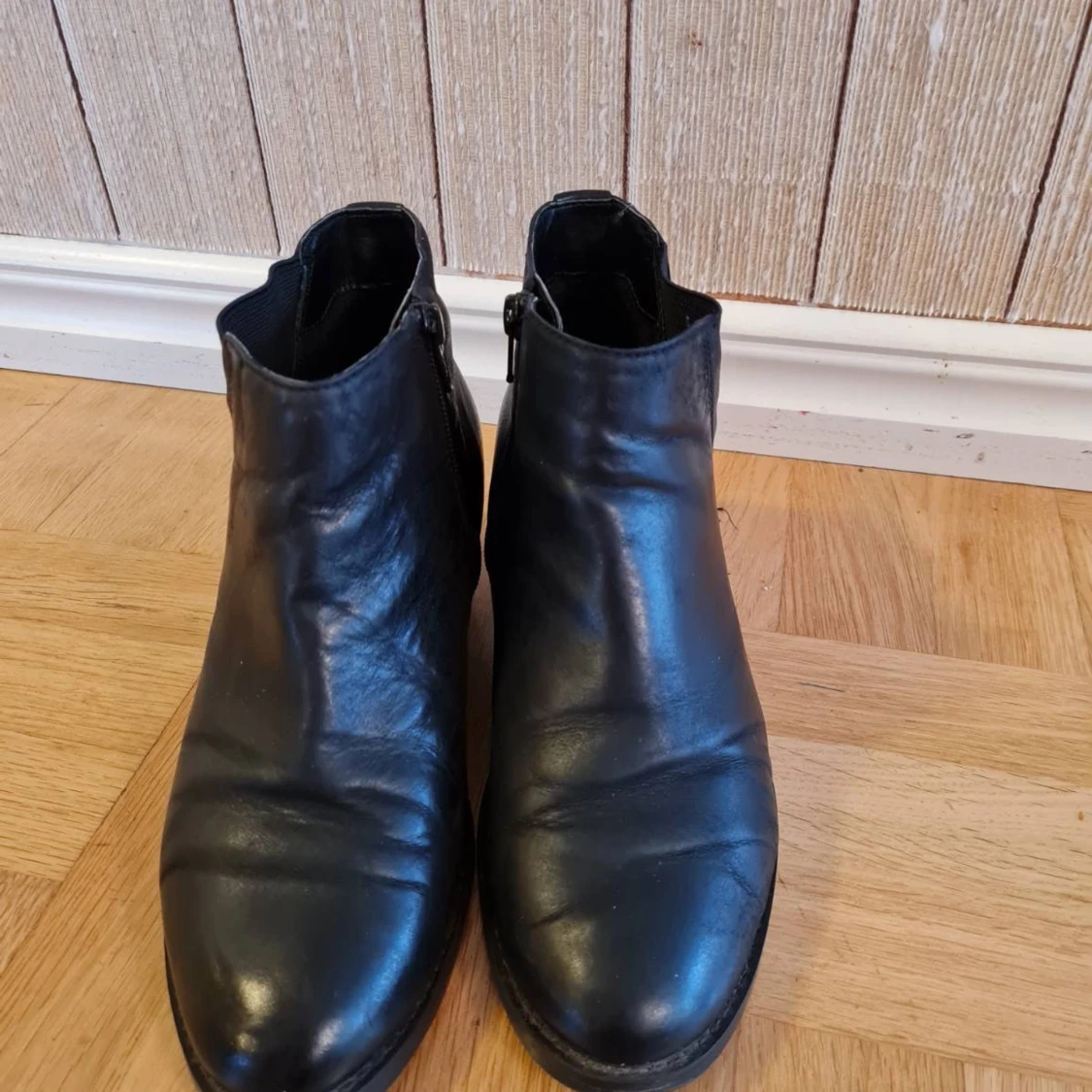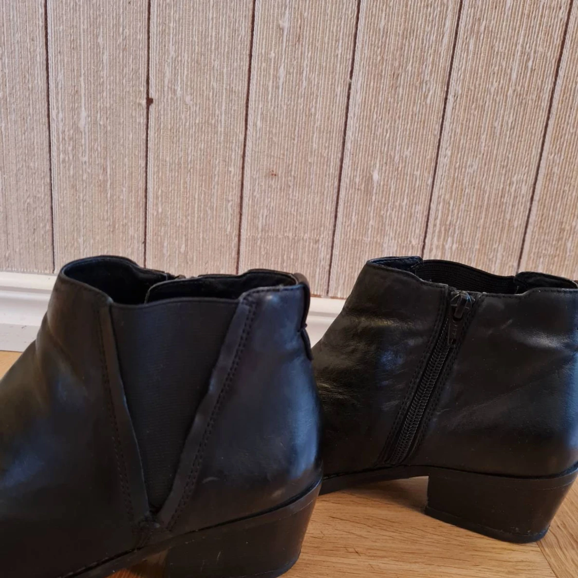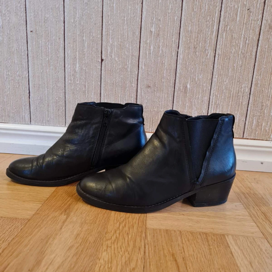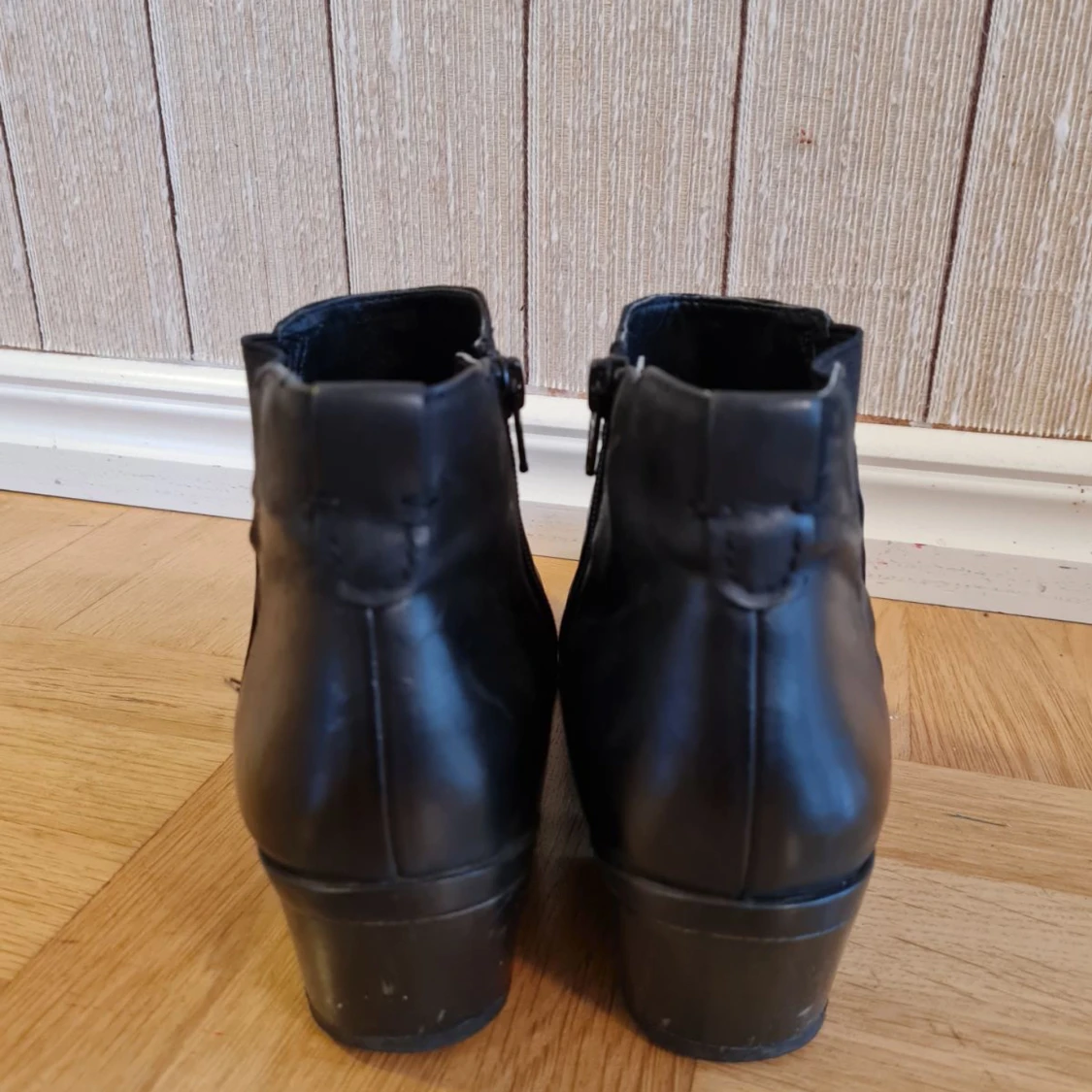 Snygga svarta stövlar i äkta läder med låg klack och rund tå. Skorna har dragkedja på insidan och elastiska partier på sidorna för enkel påtagning. Storlek 38.