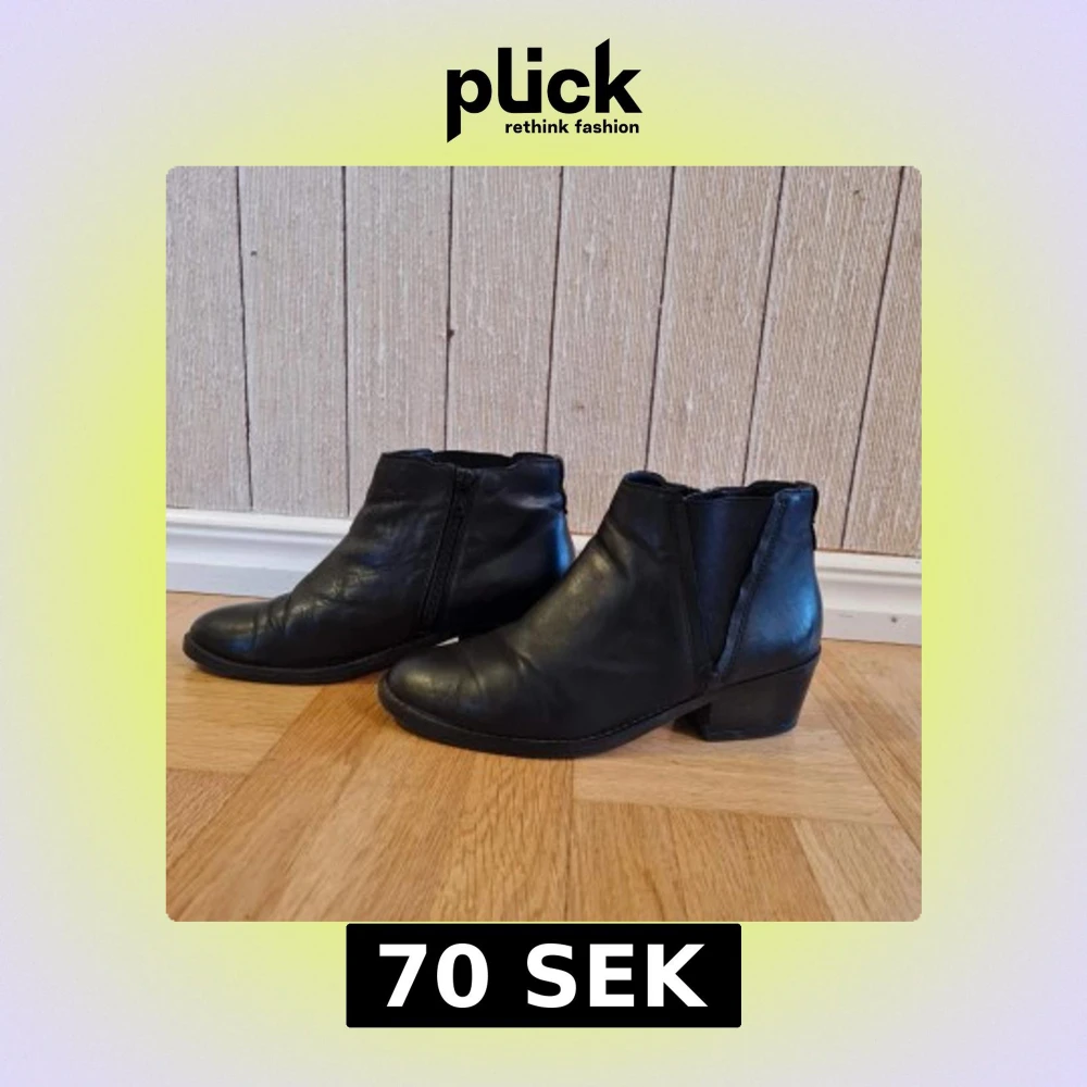 Snygga svarta stövlar i äkta läder med låg klack och rund tå. Skorna har dragkedja på insidan och elastiska partier på sidorna för enkel påtagning. Storlek 38.