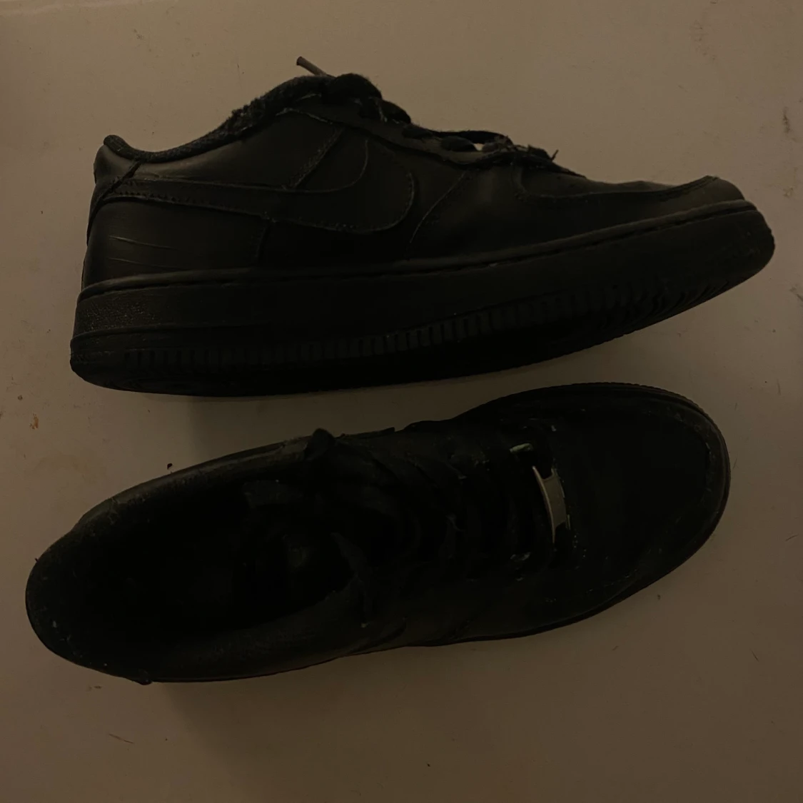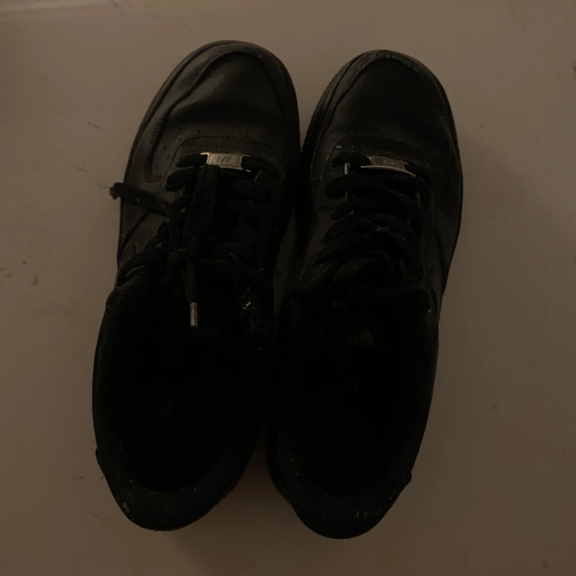 Svarta air force 1 i storlek 38, köpta 2018 men har ej använts sen 2019! knappt creasade, litet hål på insidan men stör ej, skosnörets toppar är också något slitna💅 cond 7/10, nypris 999kr