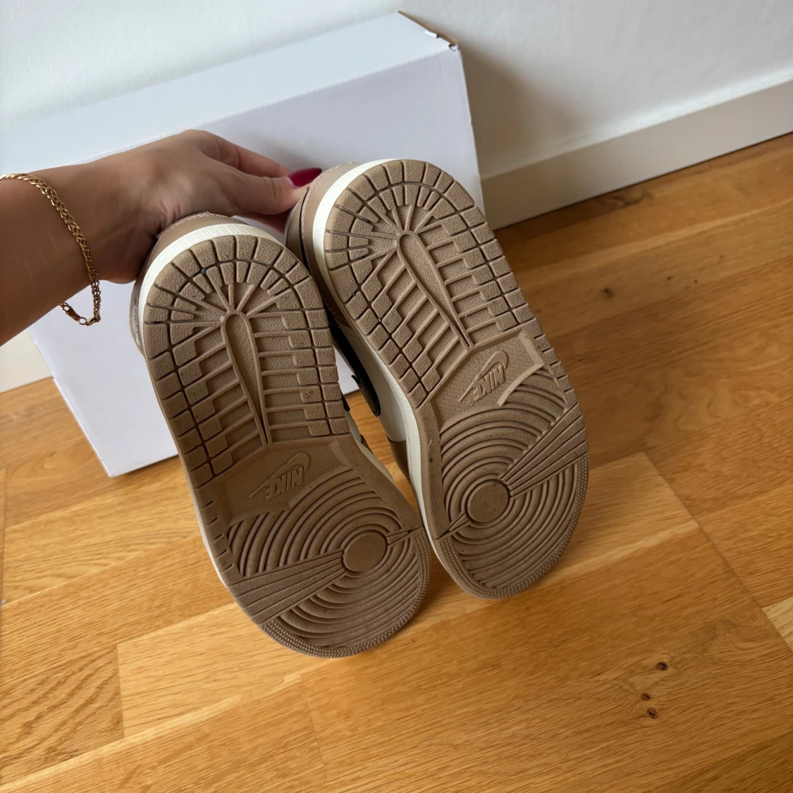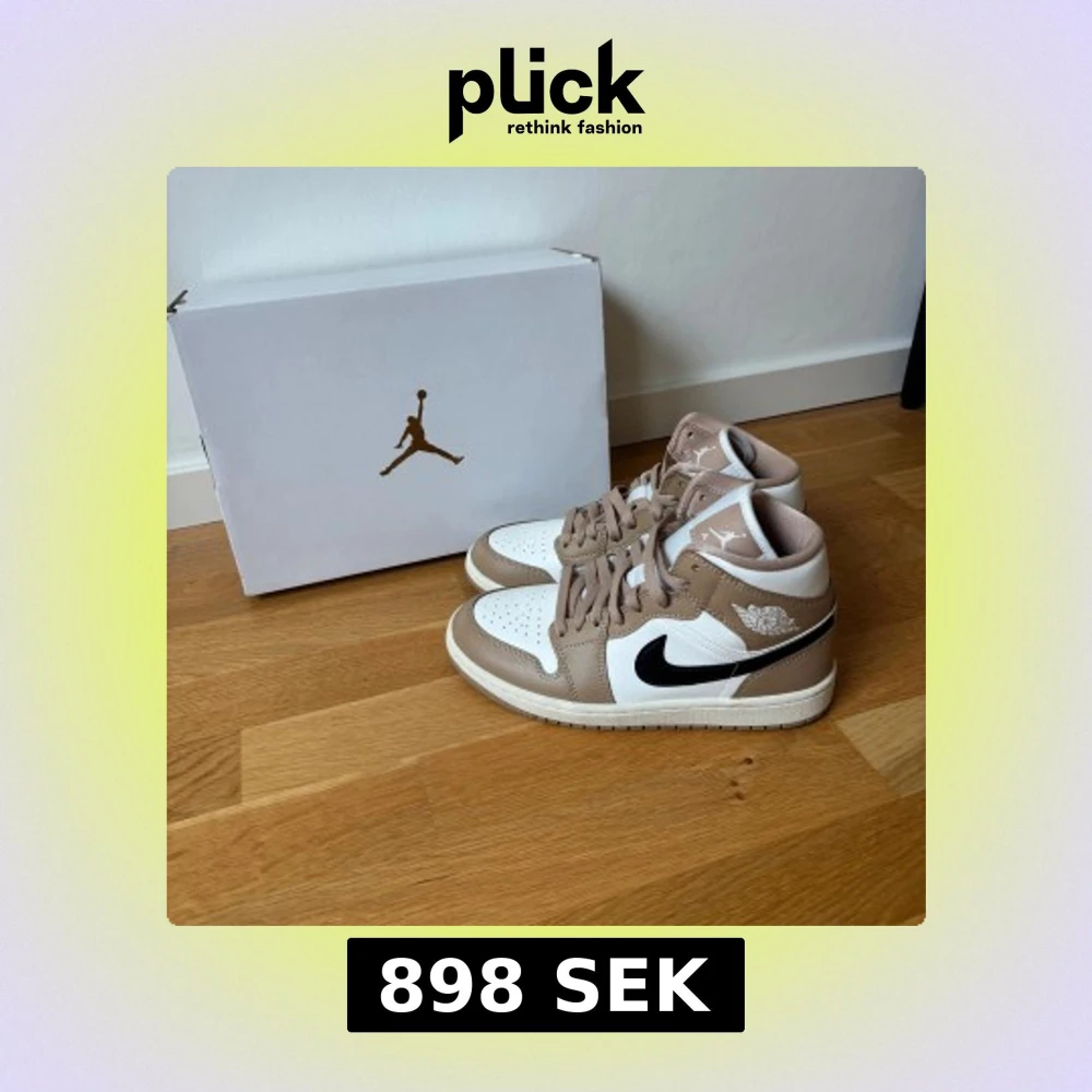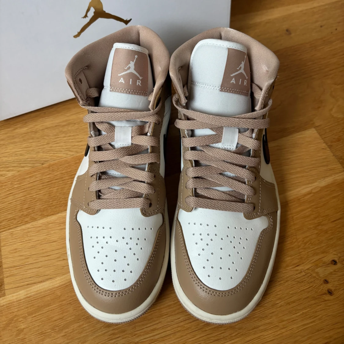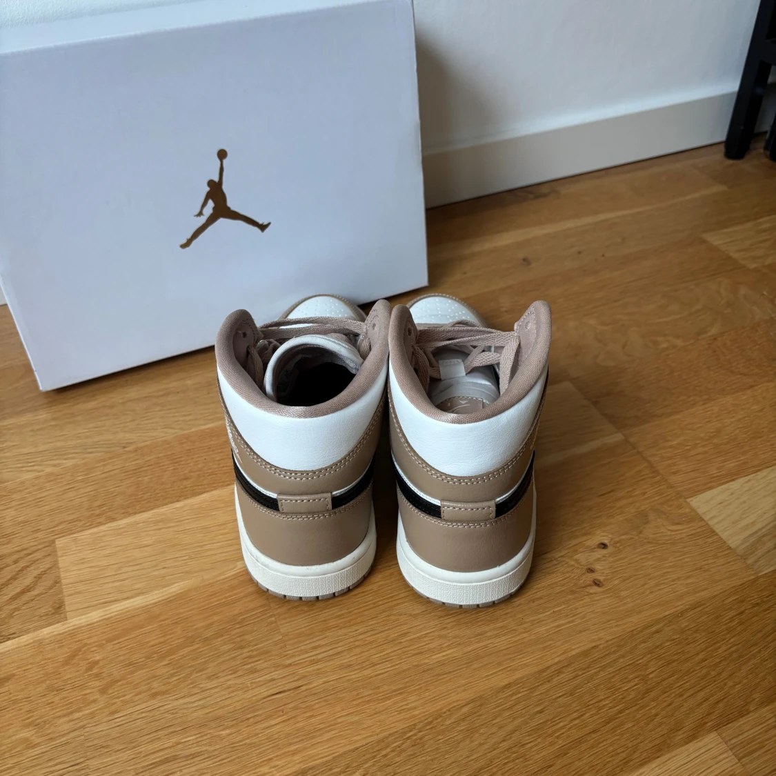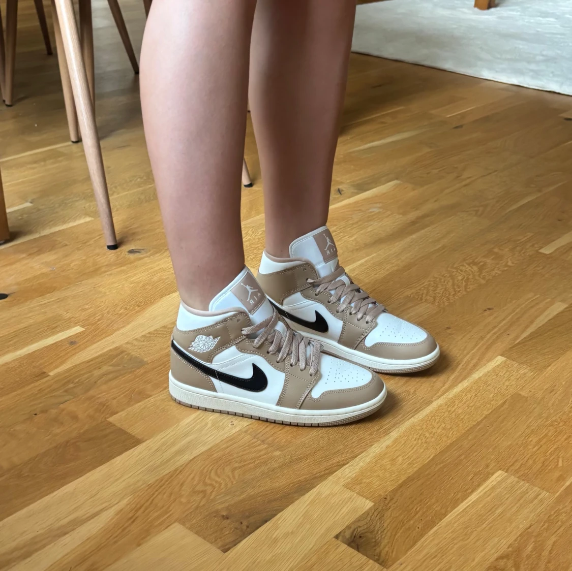 Beige / svart / vita Nike Air Jordan 1 mid. Helt oanvända, endast testade. Komplett låda medföljer. Färgkombinationen går inte att köpa ny längre. (Tips, säljs billigare på min Vinted då de ej tar 5% av försäljningen, @emmasandbrg)