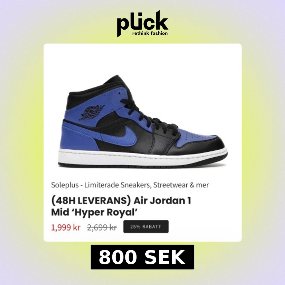Snygga Air Jordan 1 Mid 'Hyper Royal' sneakers i svart och blått. Skorna har en klassisk design med snörning och den ikoniska Air Jordan-loggan på sidan. Perfekta för streetwear-entusiaster. Skriv för bild