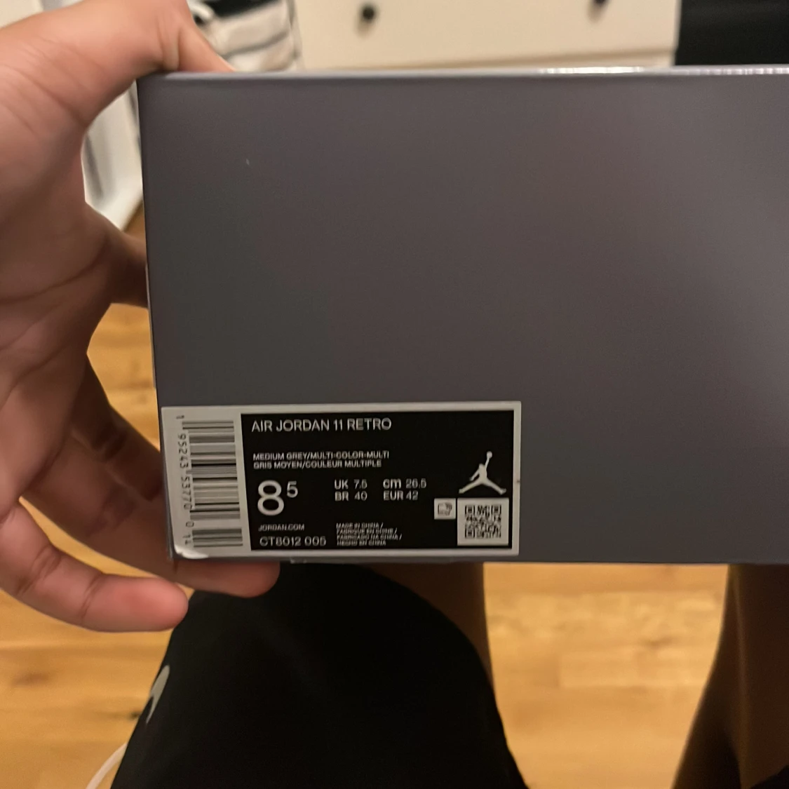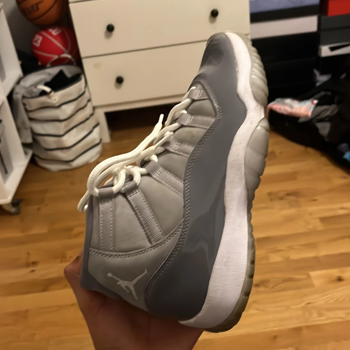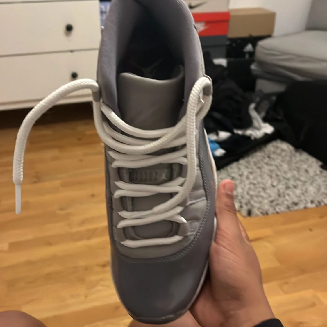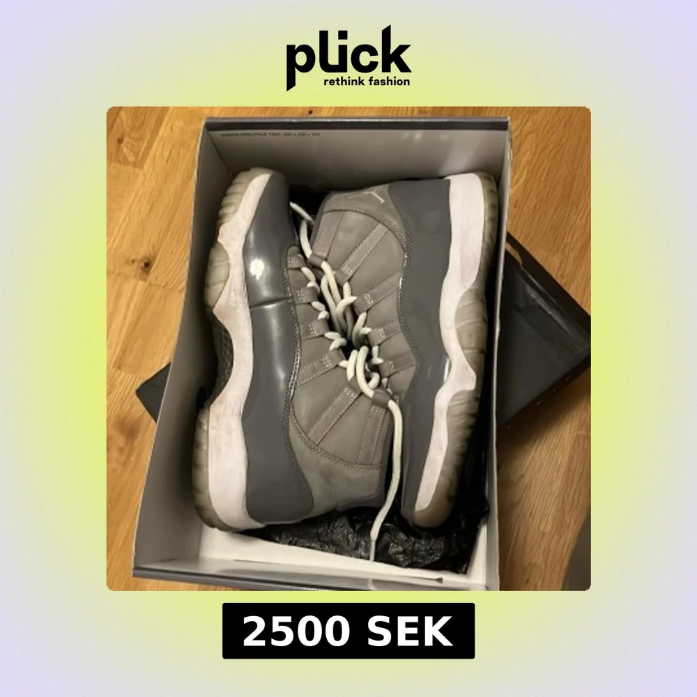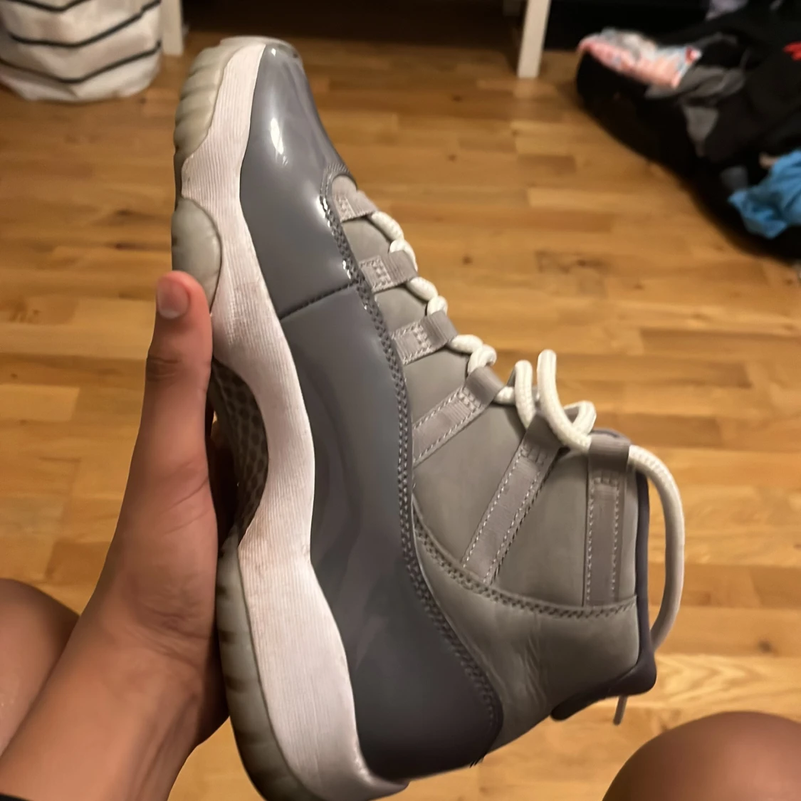 Säljer ett par Air Jordan 11 Retro i färgen Cool Grey. Skorna har en snygg mix av grå mocka och blankt syntetmaterial, vit mellansula och genomskinlig yttersula. Klassisk Jumpman-logga på hälen och vita snören. Perfekt för dig som vill sticka ut med en ikonisk sneaker.