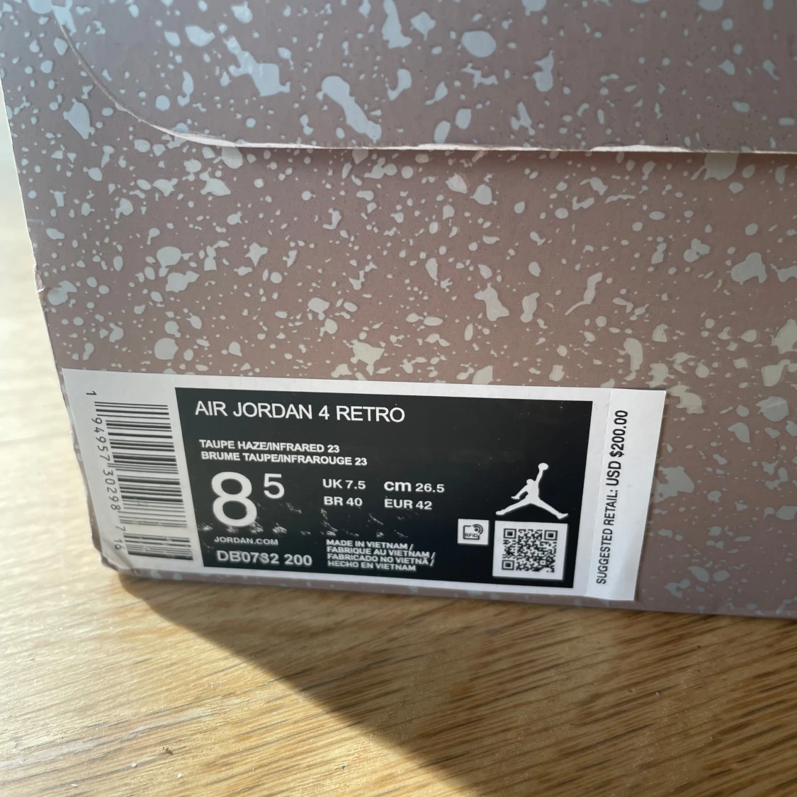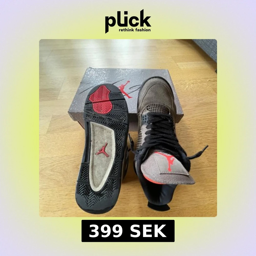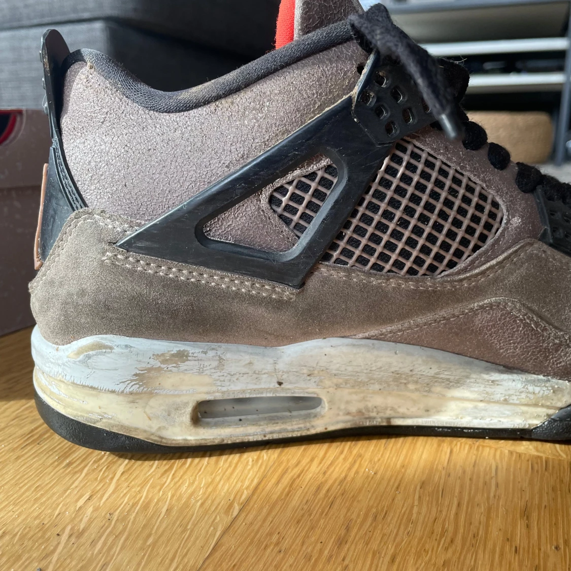 Säljer ett par Nike Air Jordan 4 Retro Taupe Haze med snygg mocka och meshdetaljer. Skorna har en brun och taupe färgskala med svarta och röda detaljer, samt den klassiska Jumpman-loggan på plösen och sulan. Perfekt för dig som vill sticka ut med en ikonisk sneaker. Storlek 42 fast är ganska tajta så skulle säga storlek 41/5
