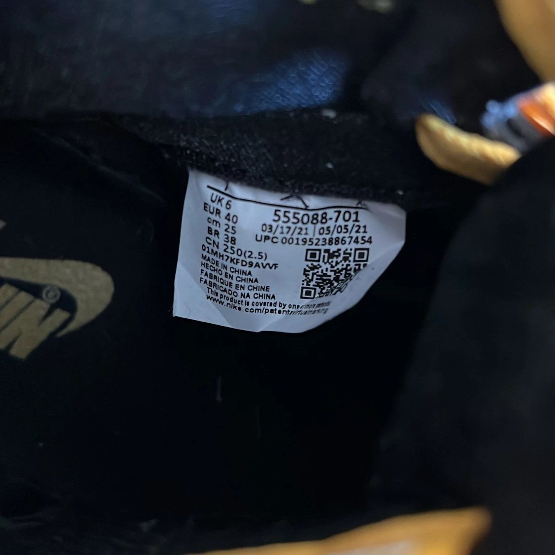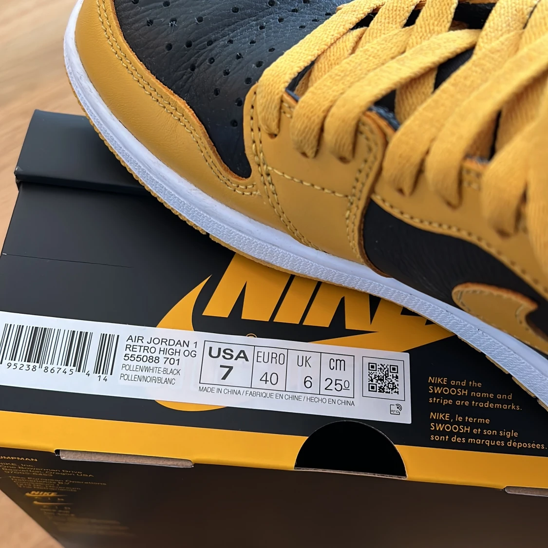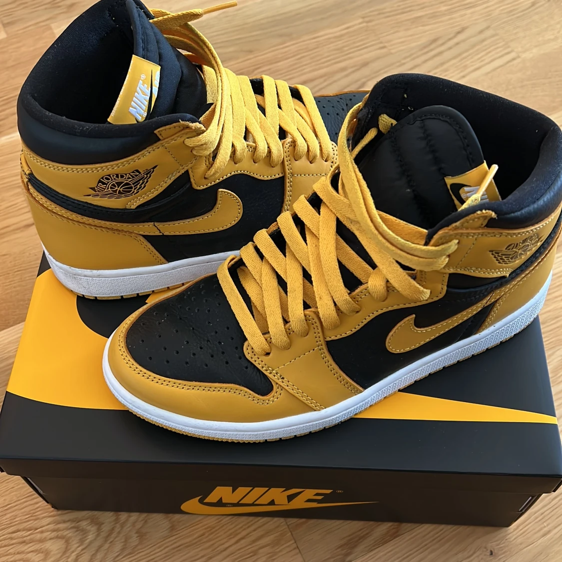 Air Jordan 1 Retro High OG Pollen (Yellow and Black) with white midsole. Size: EU 40. Worn a few times. They are rain and stain proofed. They come in their original box. Bought from SNS Stockholm. Comes with an extra pair of laces (Black).
