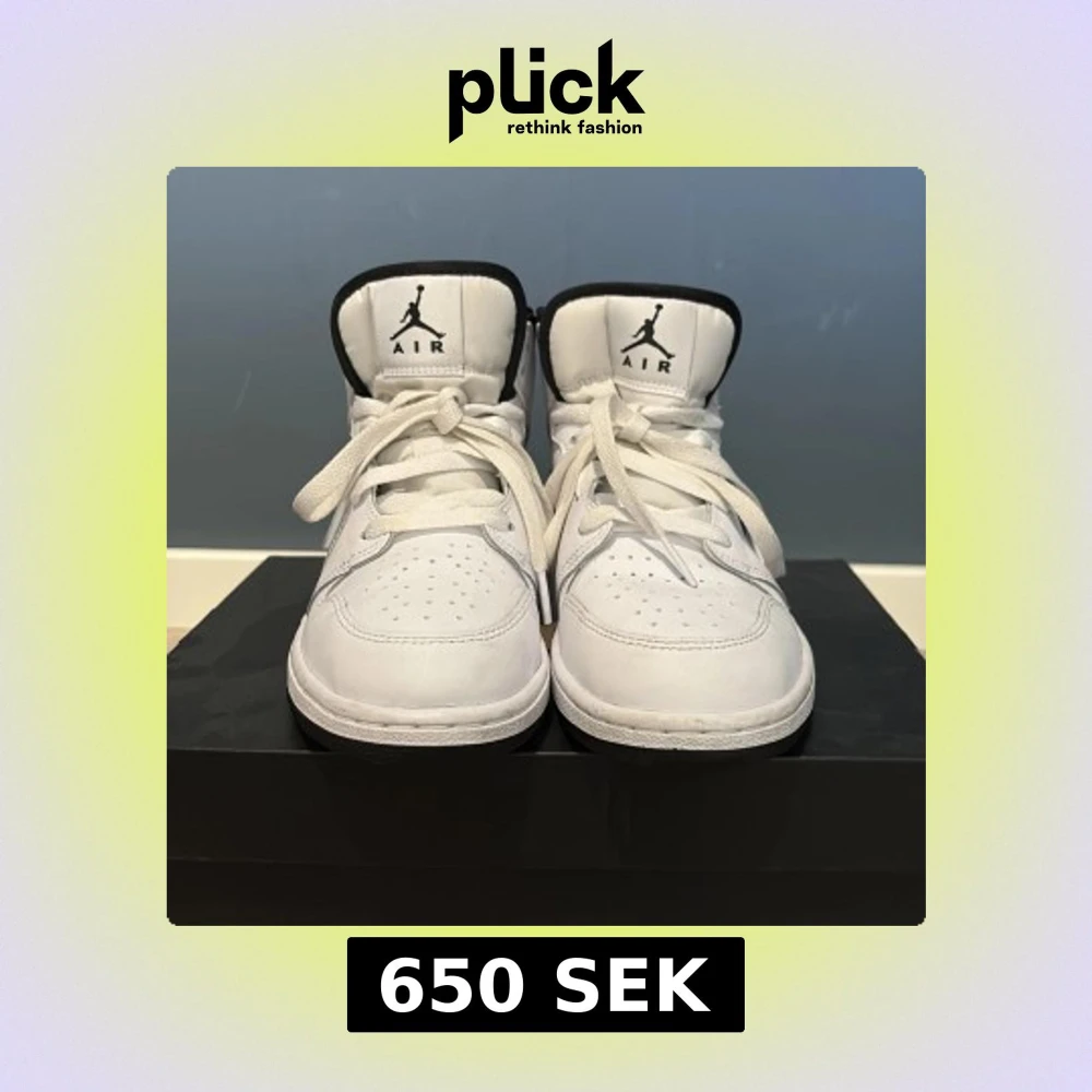 Snygga Nike Air Jordan 1 Mid sneakers i vitt och svart skinn. Klassisk siluett med svart swoosh, perforerad tå och högt skaft. Tjock vit sula och svart yttersula. Ikoniska Air Jordan-loggan på sidan och Jumpman på plösen. Perfekta för dig som gillar streetstyle. orginal box finns också. pris går att diskutera vid snabb affär.