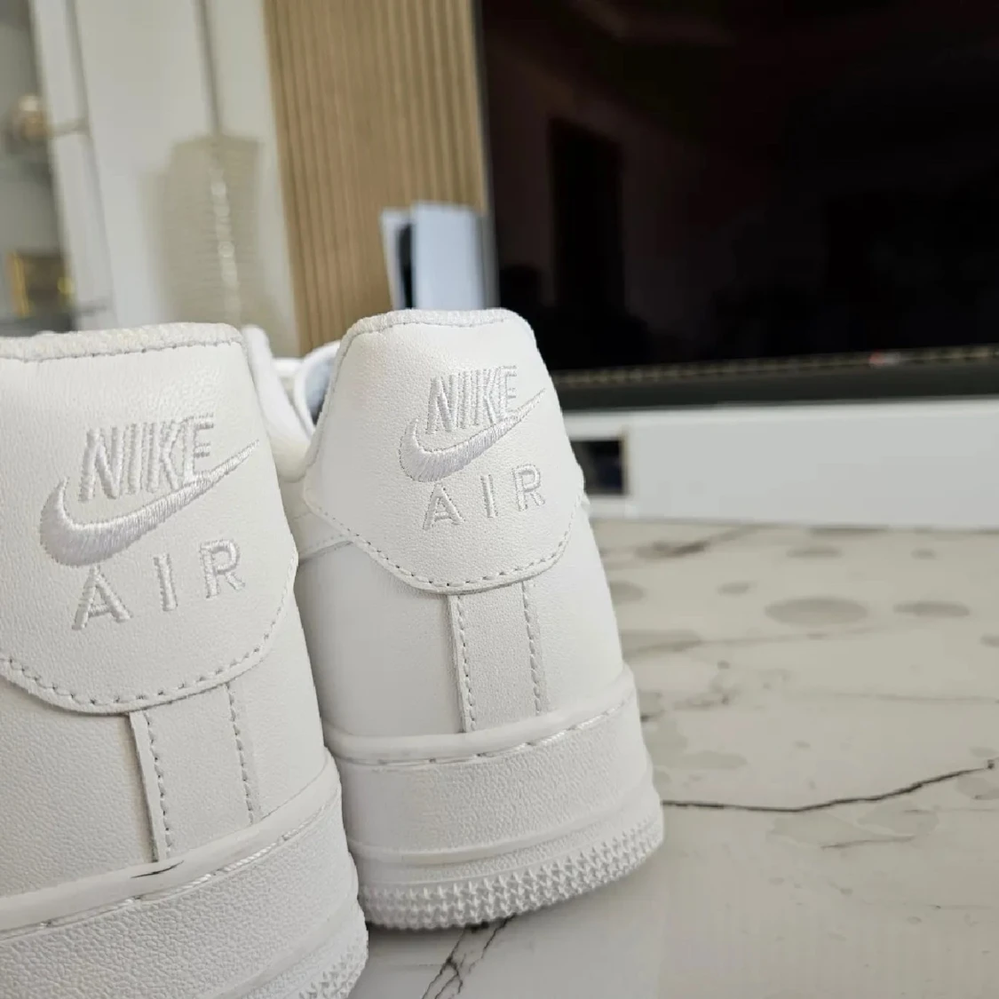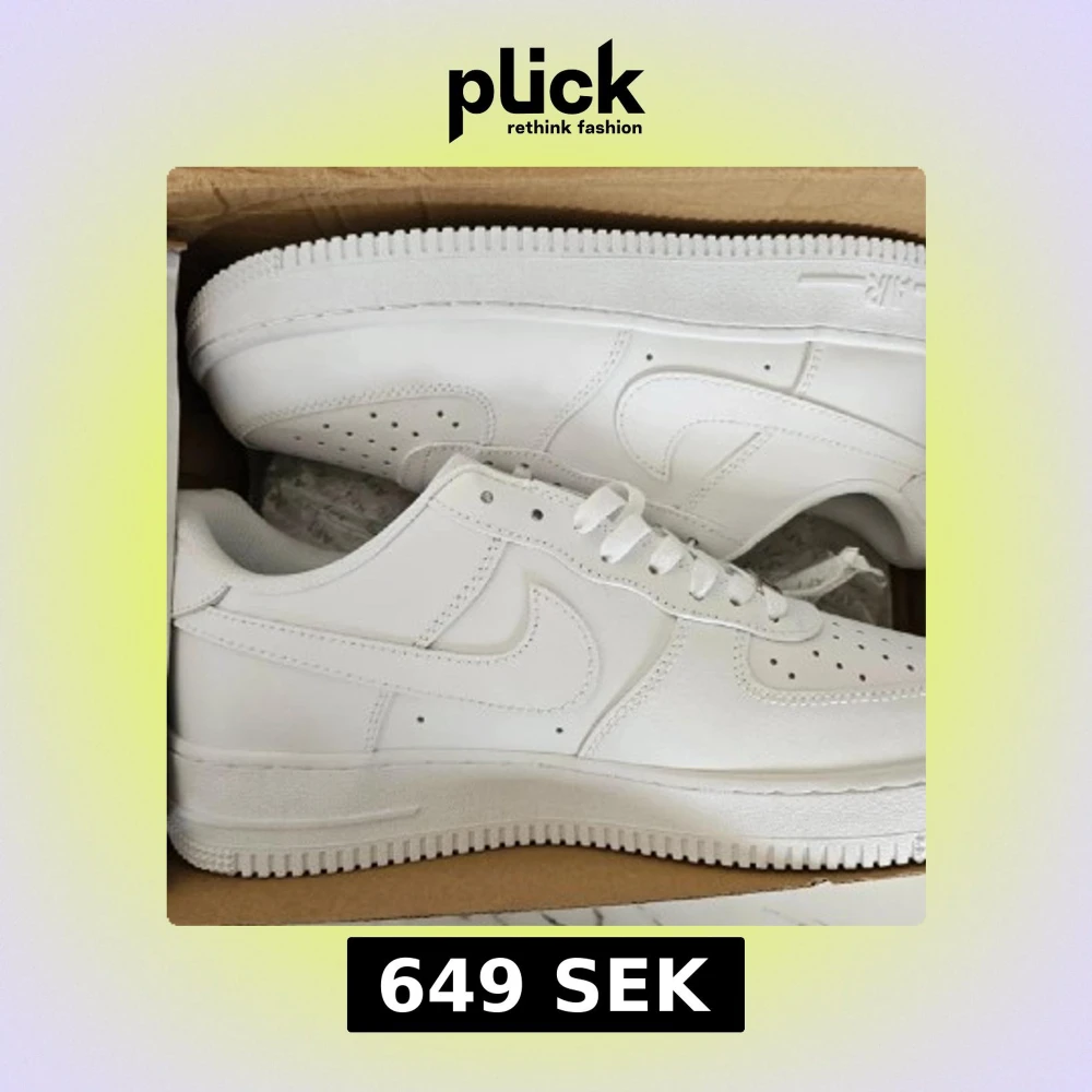 Klassiska Nike Air Force 1 sneakers i helvitt skinn. Snygg och clean design med perforerad tå, vit sula och ikonisk swoosh på sidorna. Lågt skaft och snörning framtill. Perfekta för dig som vill ha en tidlös och fräsch look. En del smuts på skorna med det går bort om du tvättar i nån minut!