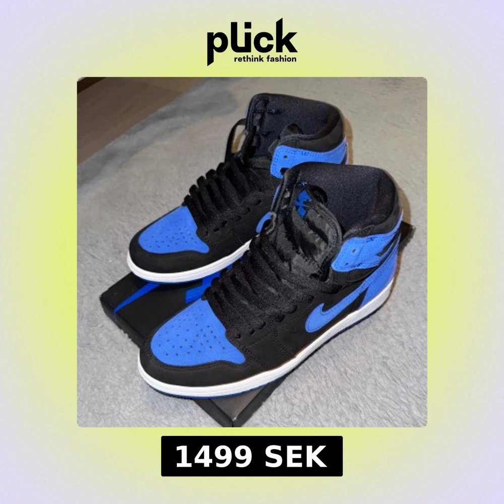 Nike Air Jordan 1 High sneakers i svart och blått med klassisk siluett. Skorna har snörning, rund tå och platt sula. Materialet är en mix av mocka och syntet, med blå yttersula och vita detaljer. Perfekt för dig som vill sticka ut med en ikonisk sneaker.