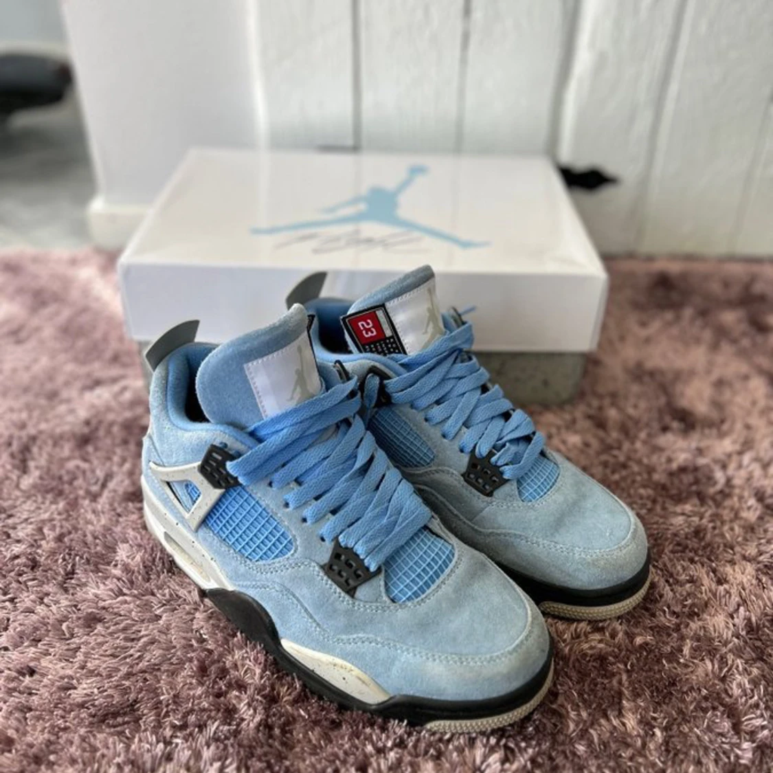 Jag säljer mina Air Jordan 4 Retro ”University Blue” Sneakers som är inte så jättemycket använda köpte dom för 2 månader sedan det är storlek 42