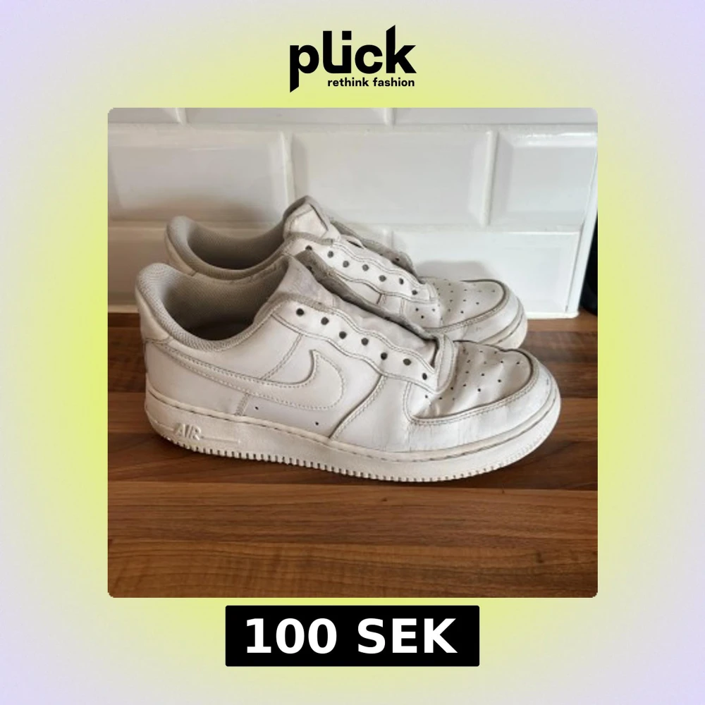 Säljer ett par klassiska vita Nike Air Force sneakers. Skorna har en stilren design och den ikoniska Nike-loggan på sidan. Perfekta för en avslappnad och sportig look. Snören medföljer, ingen box kvar.