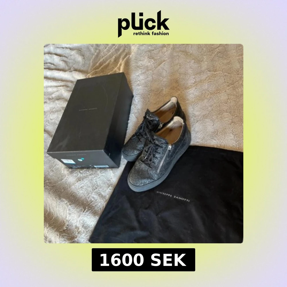 Snygga svarta sneakers från Giuseppe Zanotti med glittrig yta, snörning och dragkedja på sidorna. Skorna har platt sula och rund tå, samt exklusiva detaljer som signaturlogga på plösen. Perfekta för dig som vill sticka ut med stil. Storlek 41 men passar även 42. Öppen för bud.