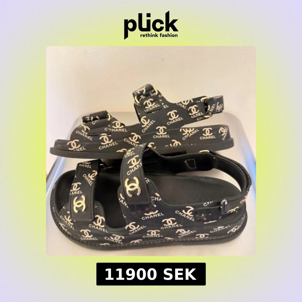 Äkta! Slutsålda coola klassiker!!Svarta sandaler från Chanel med platt sula och rund tå. Sandalerna har flera remmar med justerbart spänne och är täckta av vita Chanel-loggor i ett mönster. Materialet är syntet och detaljerna är i guld. Perfekt för dig som gillar statement pieces och lyxig streetstyle.