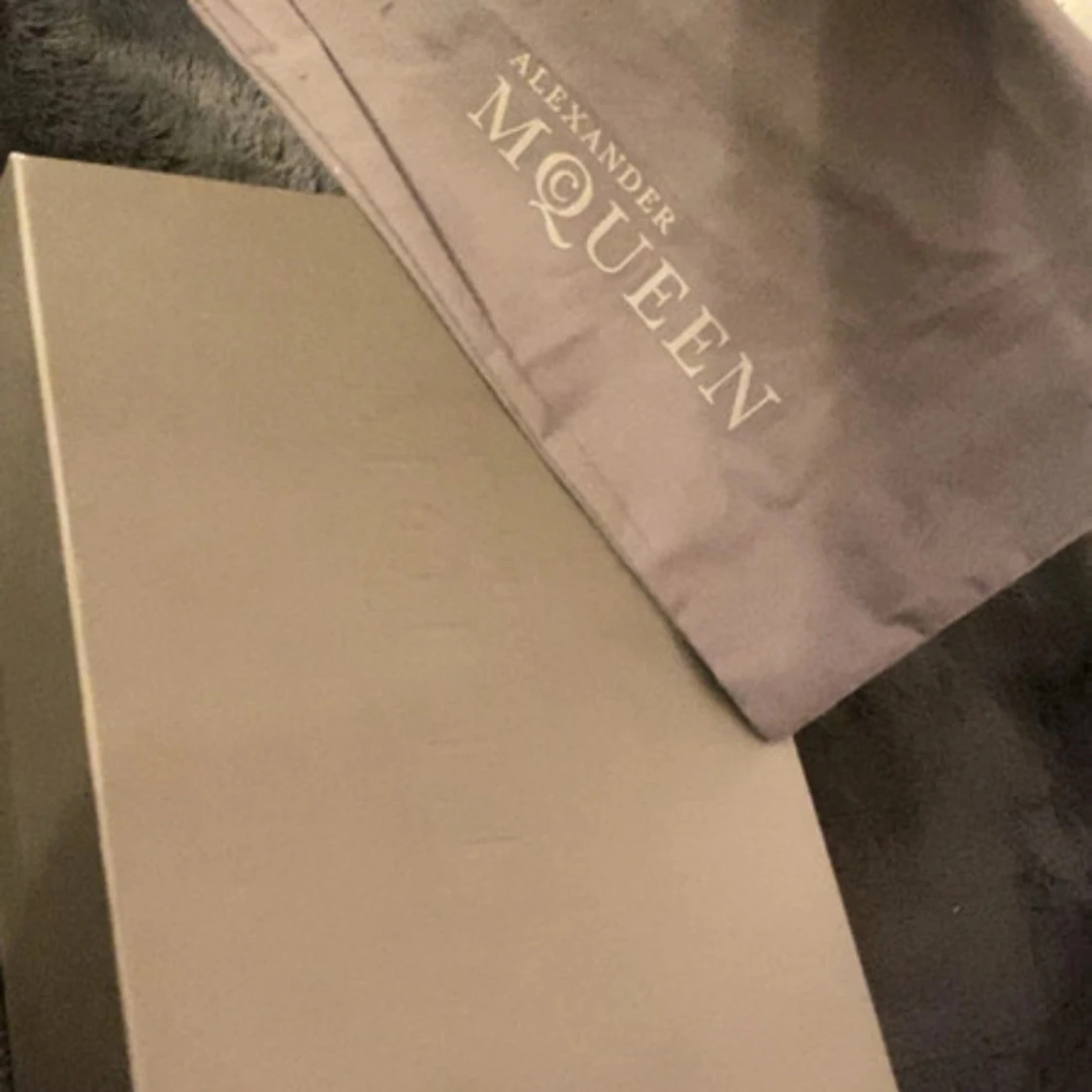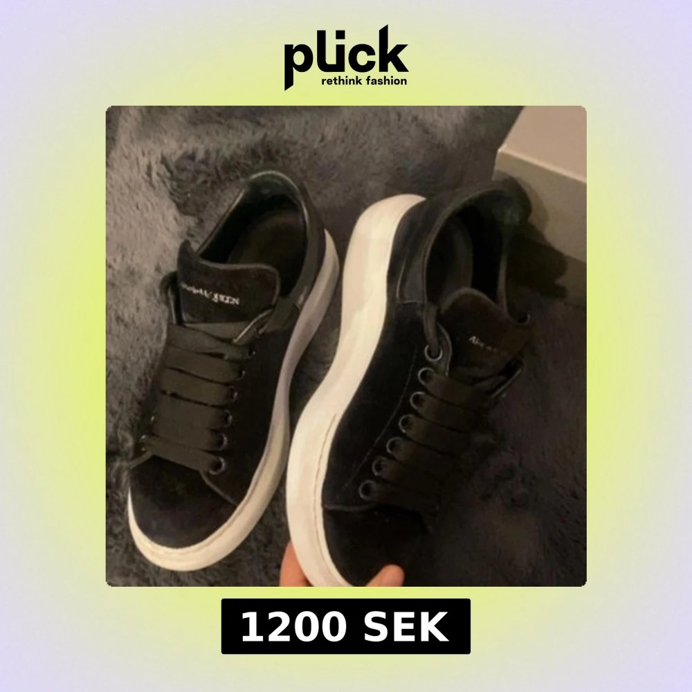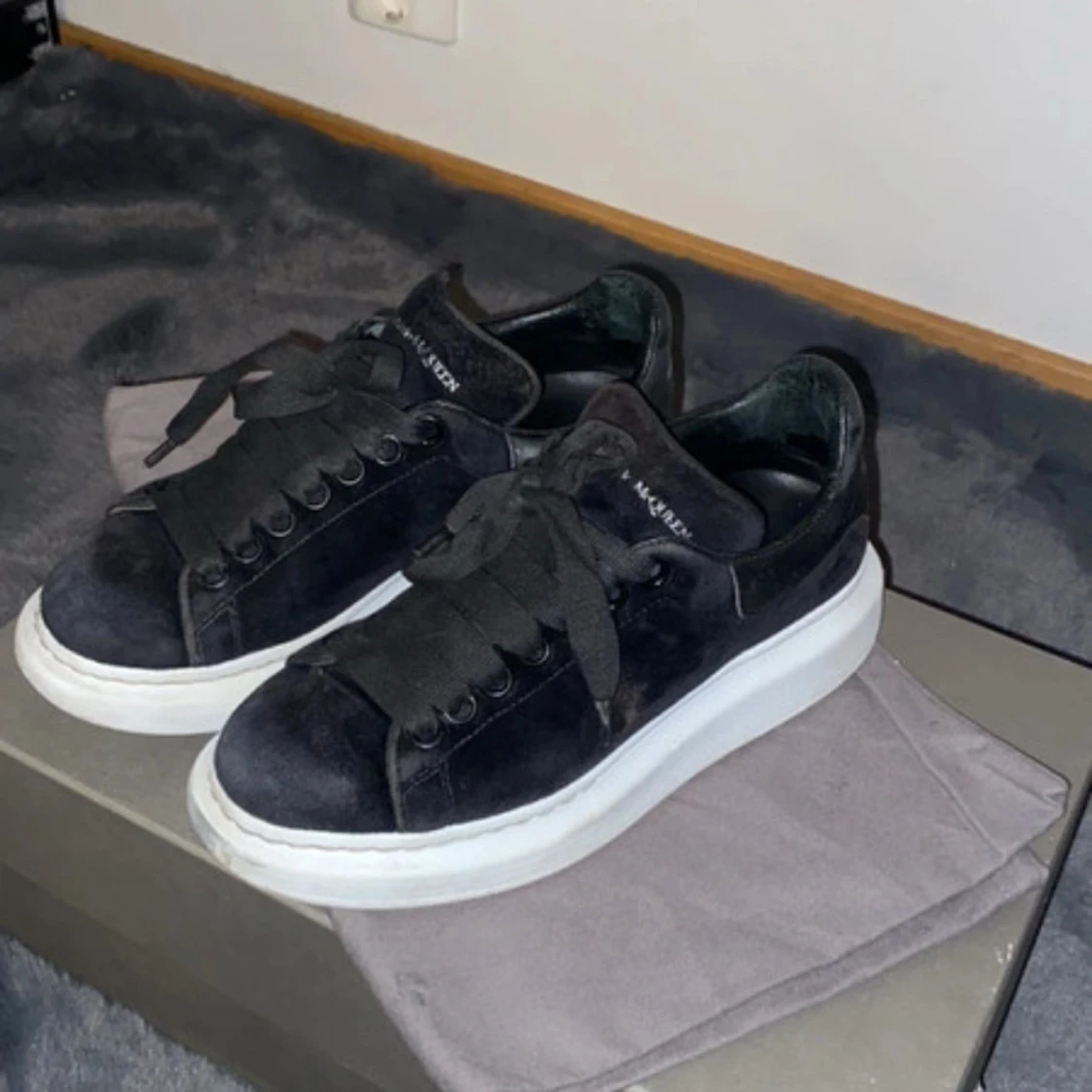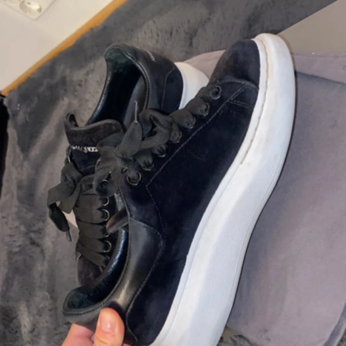 Svarta sneakers från Alexander McQueen med bred vit platt sula och klassisk snörning. Ovandelen är i mocka och skinn, med logga på plösen. Snygg chunky siluett som ger en cool vibe till outfiten.