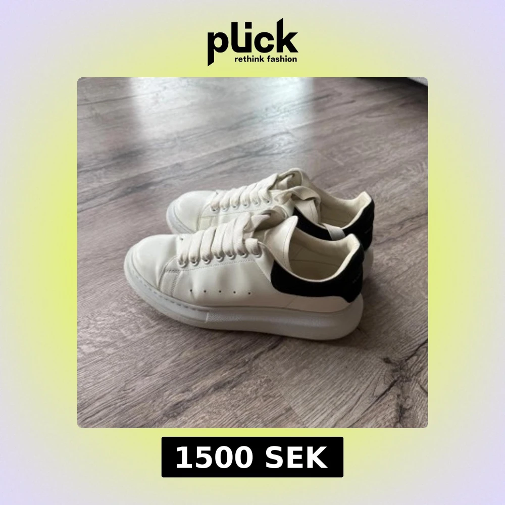 Stilrena vita sneakers från Alexander McQueen med svart mockadetalj och guldfärgad logga på hälen. Skorna har tjock sula, rund tå och klassisk snörning. Perfekta för dig som gillar en clean och lyxig look. Skick 8/10. Skicka pm vid minsta fundering