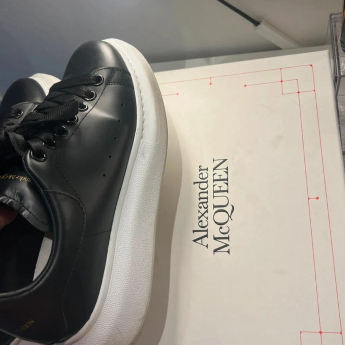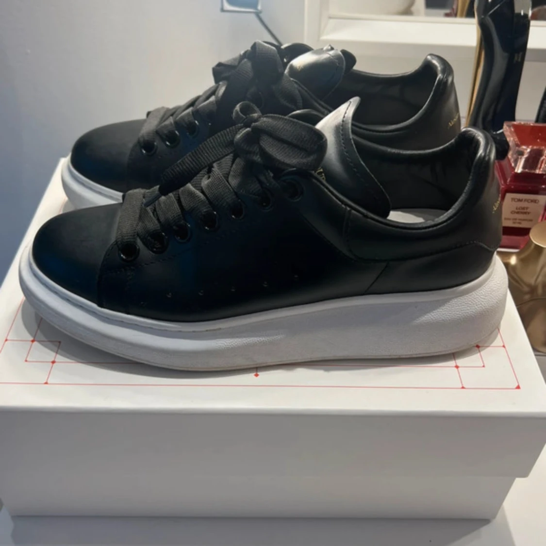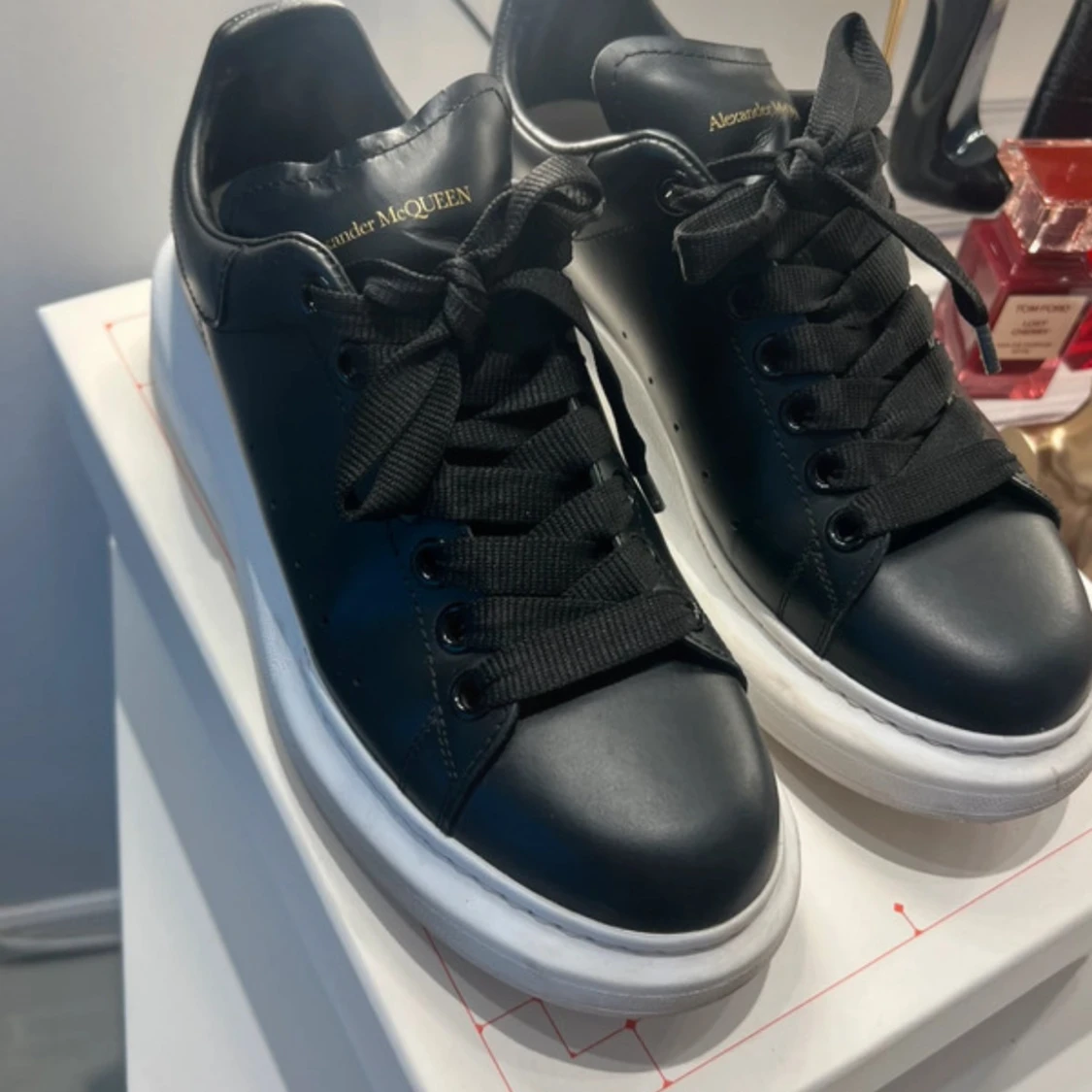 Snygga svarta sneakers från Alexander McQueen med vit plattformssula och rund tå. Skorna har breda svarta snören och guldfärgad logga på plösen. Tillverkade i skinn med stilren design och chunky siluett som ger en cool vibe.