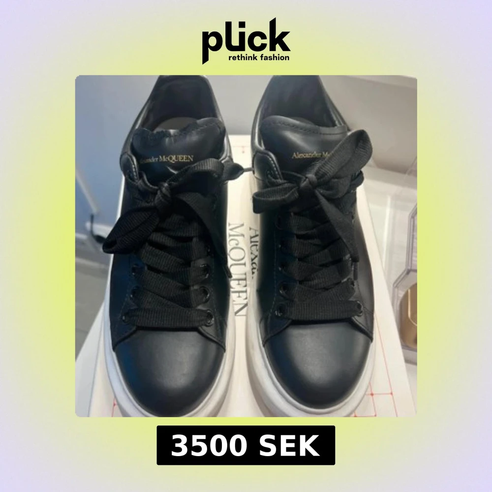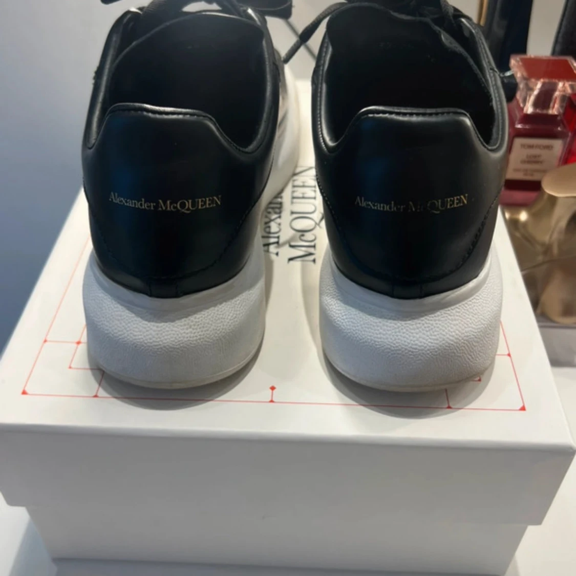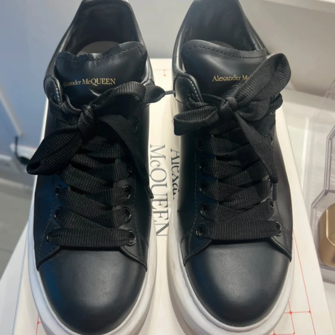 Snygga svarta sneakers från Alexander McQueen med vit plattformssula och rund tå. Skorna har breda svarta snören och guldfärgad logga på plösen. Tillverkade i skinn med stilren design och chunky siluett som ger en cool vibe.
