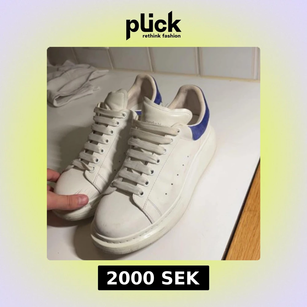 Säljer ett par feta Alexander McQueen sneakers i vitt skinn med chunky sula och blå mockadetalj på hälen. Klassisk siluett med rund tå, snörning och diskret logga bak. Perfekta för dig som vill sticka ut med stilrena men ändå unika skor.
