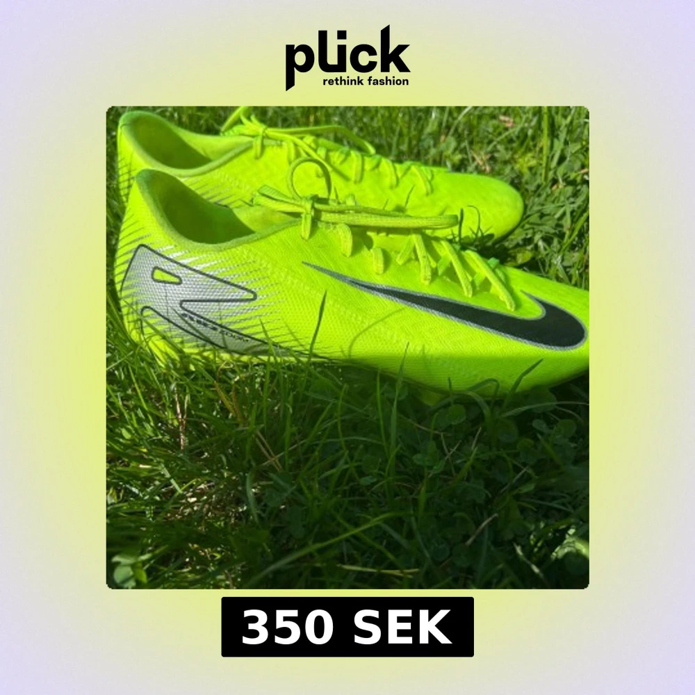 Säljer ett par riktigt snygga neongula Nike fotbollsskor med svart swoosh och silvriga detaljer. Skorna har snörning och är tillverkade i lätt syntetmaterial för bästa känsla på planen. Utrustade med fasta dobbar för gräs. Perfekta för dig som vill sticka ut på matchen!