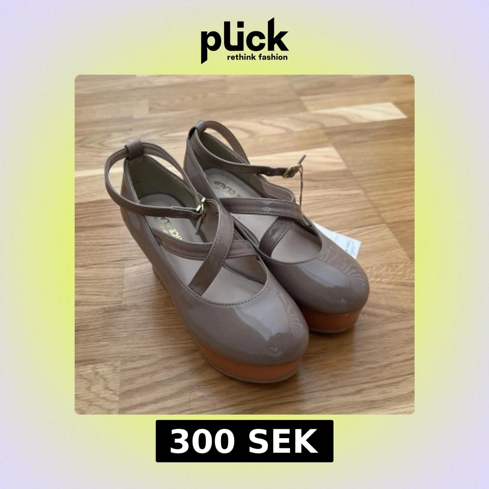 Snygga beige ballerinaskor med glansig finish och bred platåsula i trälook. Skorna har rund tå, korsade remmar över foten och justerbart spänne vid ankeln. Och kommer med extra band. Perfekt för dig som vill sticka ut med en unik och trendig look.