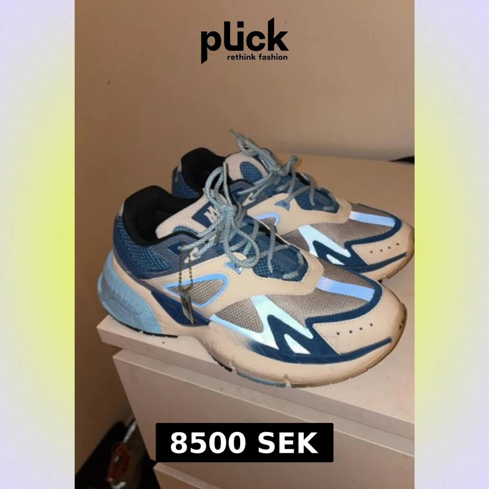 Säljer ett par AMIRI sneakers i storlek 44 med snygg design i olika blå toner, vitt och grått. Skorna har mesh och skinnpaneler, ljusblå snörning och AMIRI-logga på hälen. Platt sula och rund tå, perfekt för dig som gillar streetwear och exklusiva märken.