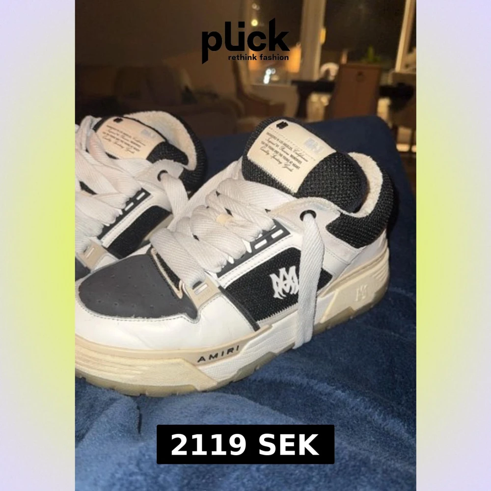 Säljer ett par AMIRI MA-1 sneakers i svart och vitt med grå detaljer. Skorna har breda vita snören, perforerad tå och tydlig AMIRI-logga på sidan och sulan. Ovandelen är i skinn och textil, med en chunky beige sula för en cool streetwear-look.
