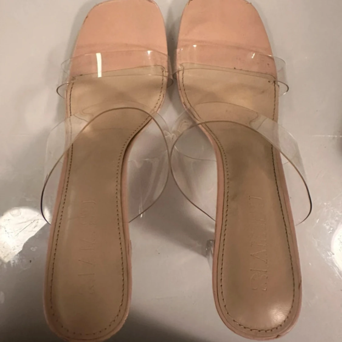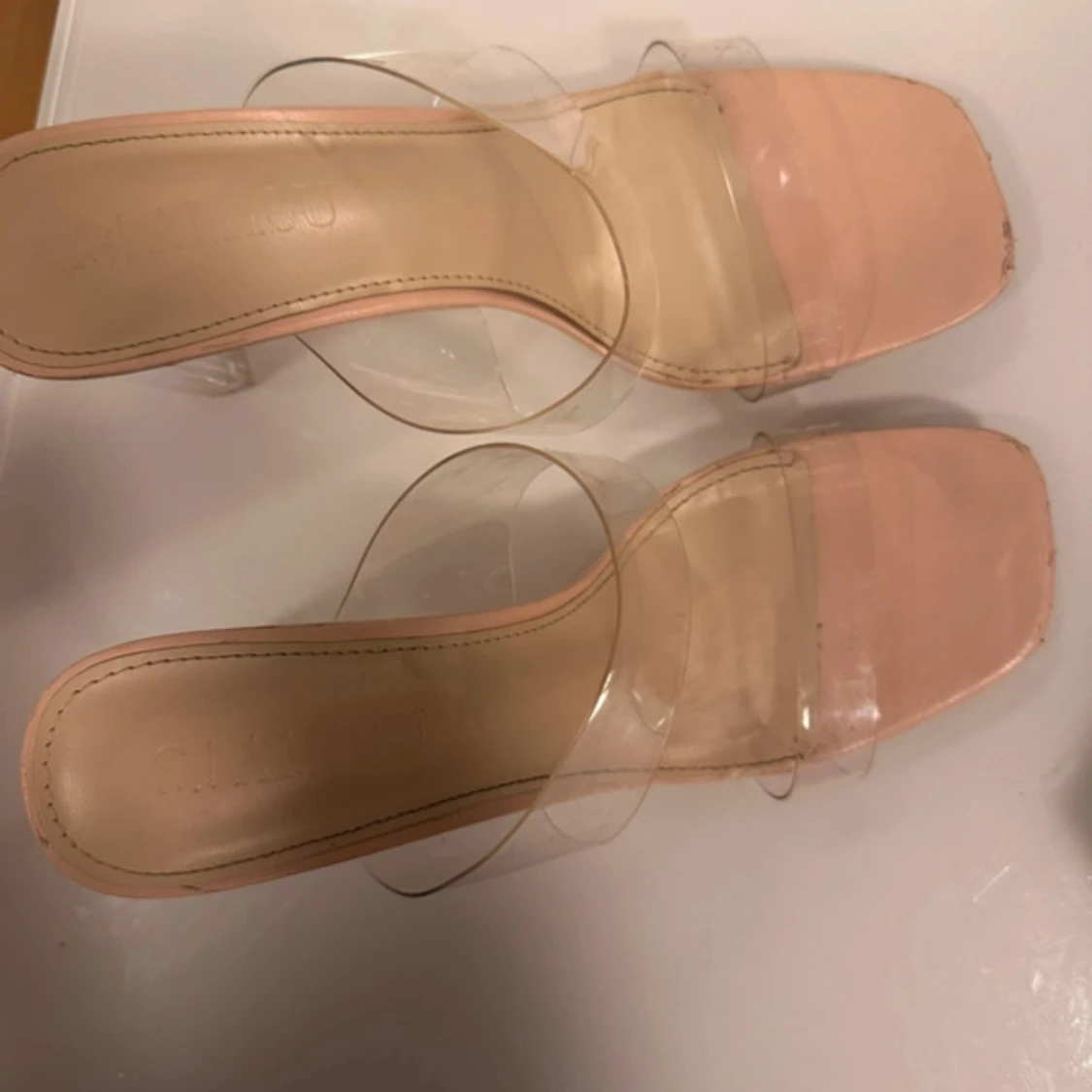 Säljer ett par trendiga sandaler med transparenta remmar och klack. Skorna har en fyrkantig tå och nude-färgad sula. Klacken är i genomskinlig plast vilket ger en modern vibe. Perfekta för dig som gillar stilrena och minimalistiska skor.