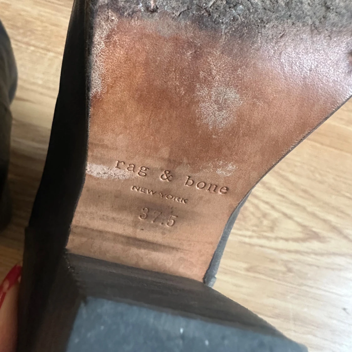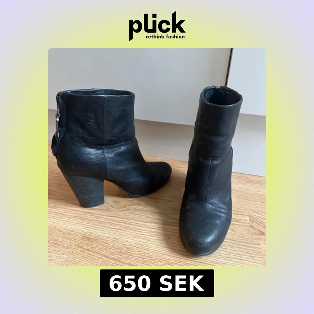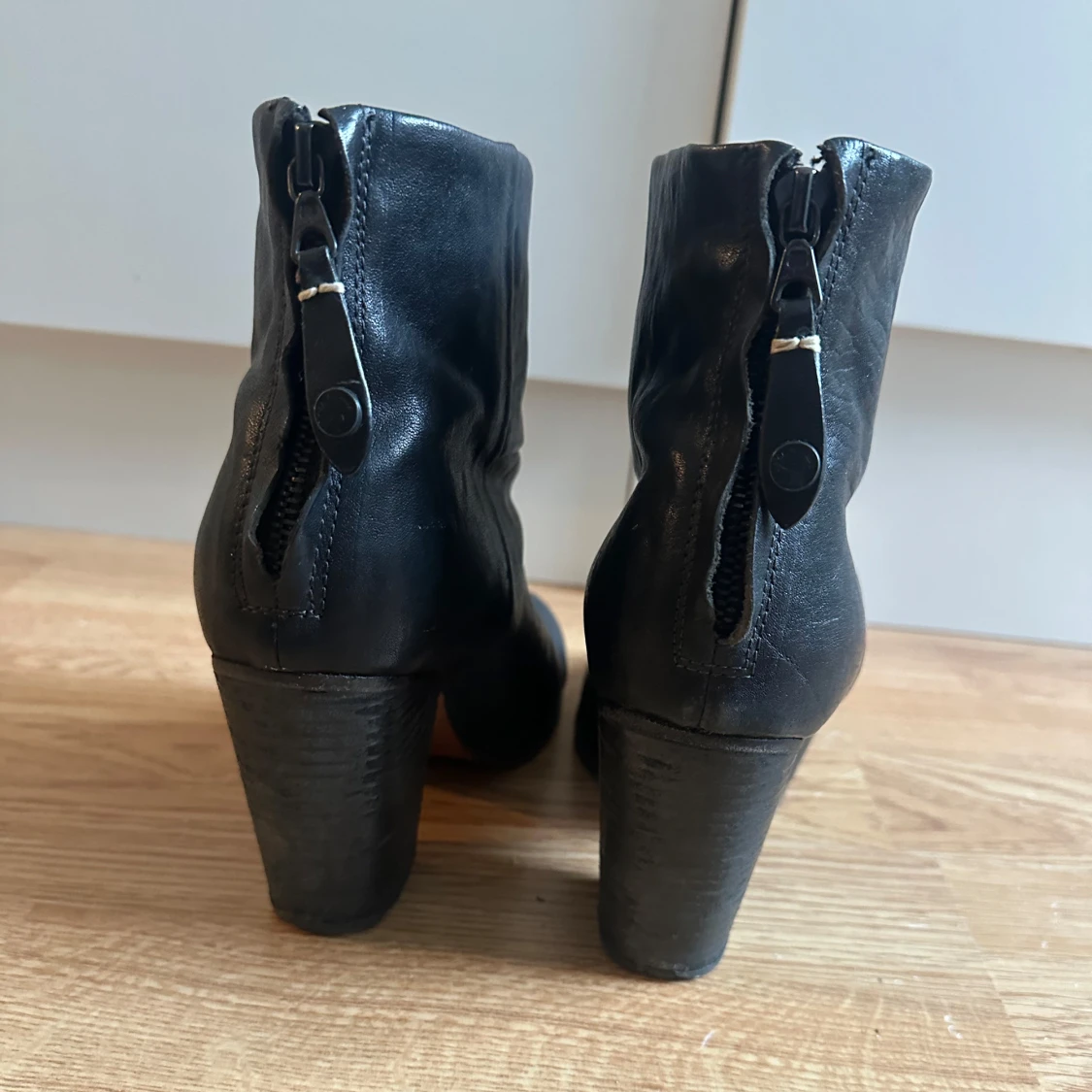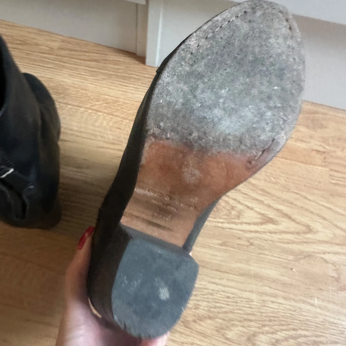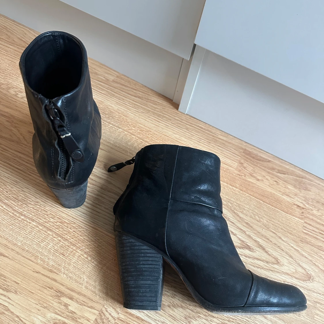 Säljer ett par svarta stövletter i äkta skinn med kraftig klack och dragkedja bak. Skorna har en rund tå och stilren design som passar till många outfits. Perfekta för dig som gillar boots med lite höjd och snygg siluett. Klacken är 9cm
