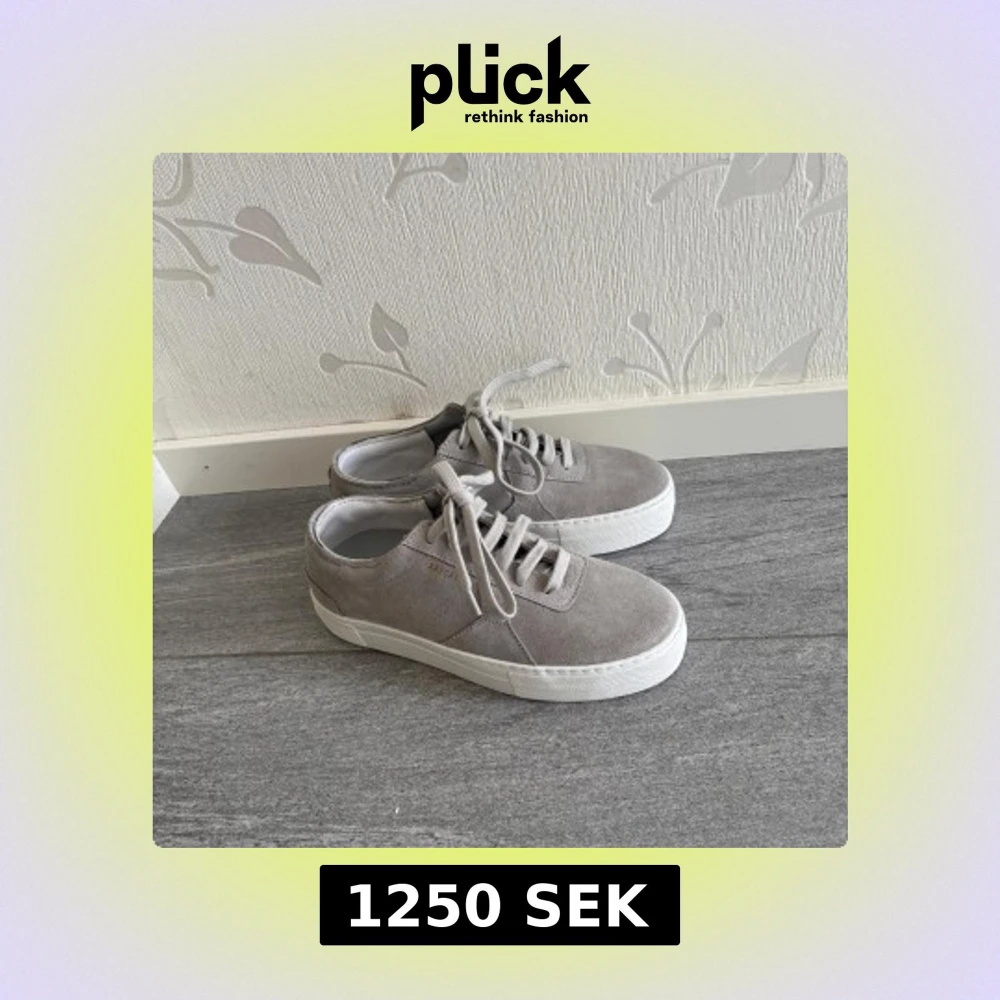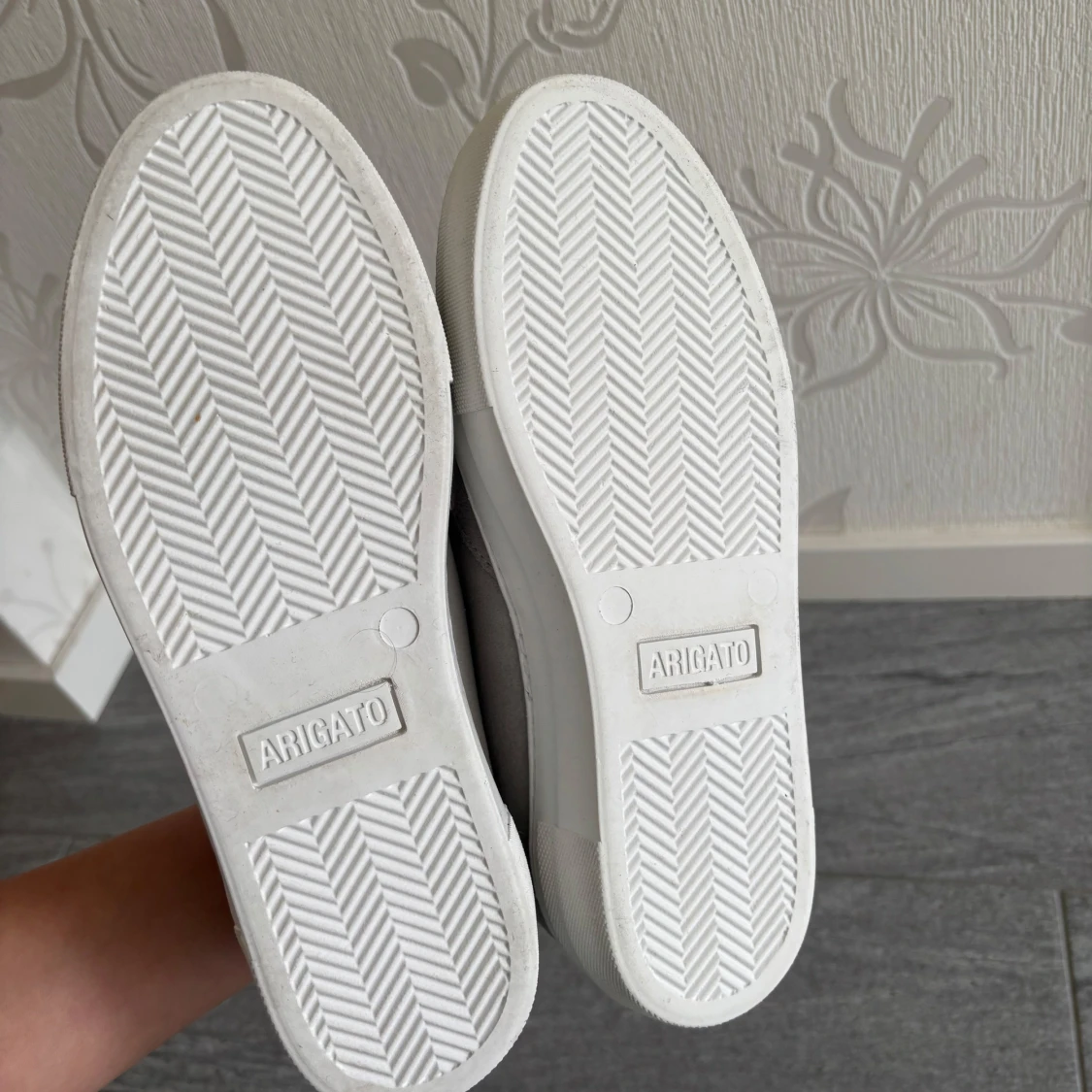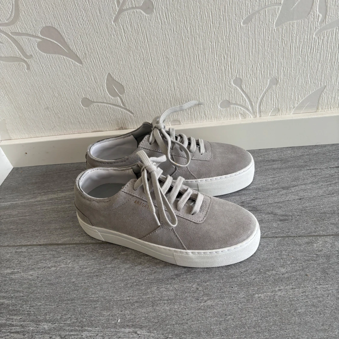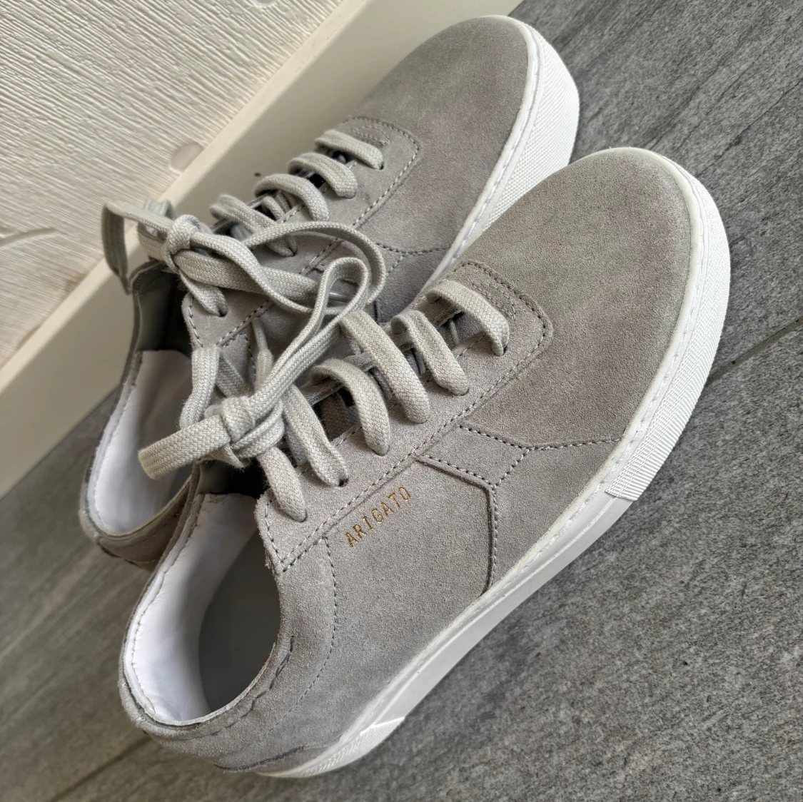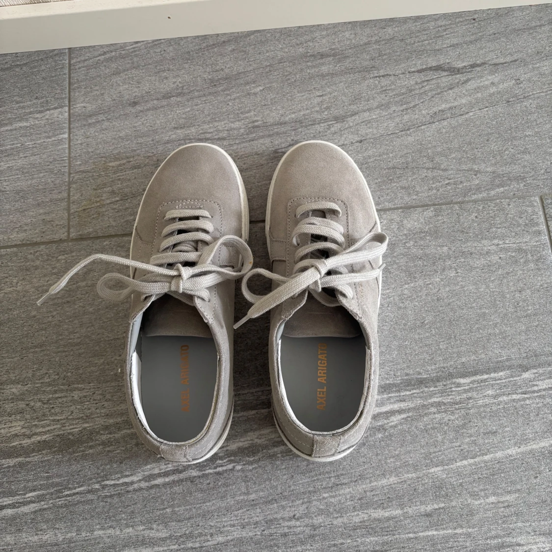 Snygga sneakers från Axel Arigato i ljusgrå mocka med vita, platta sulor och klassisk snörning. Minimalistisk design med rund tå och diskret logga i guld på sidan. Perfekta för en clean och stilren look. Burits en gång innan!